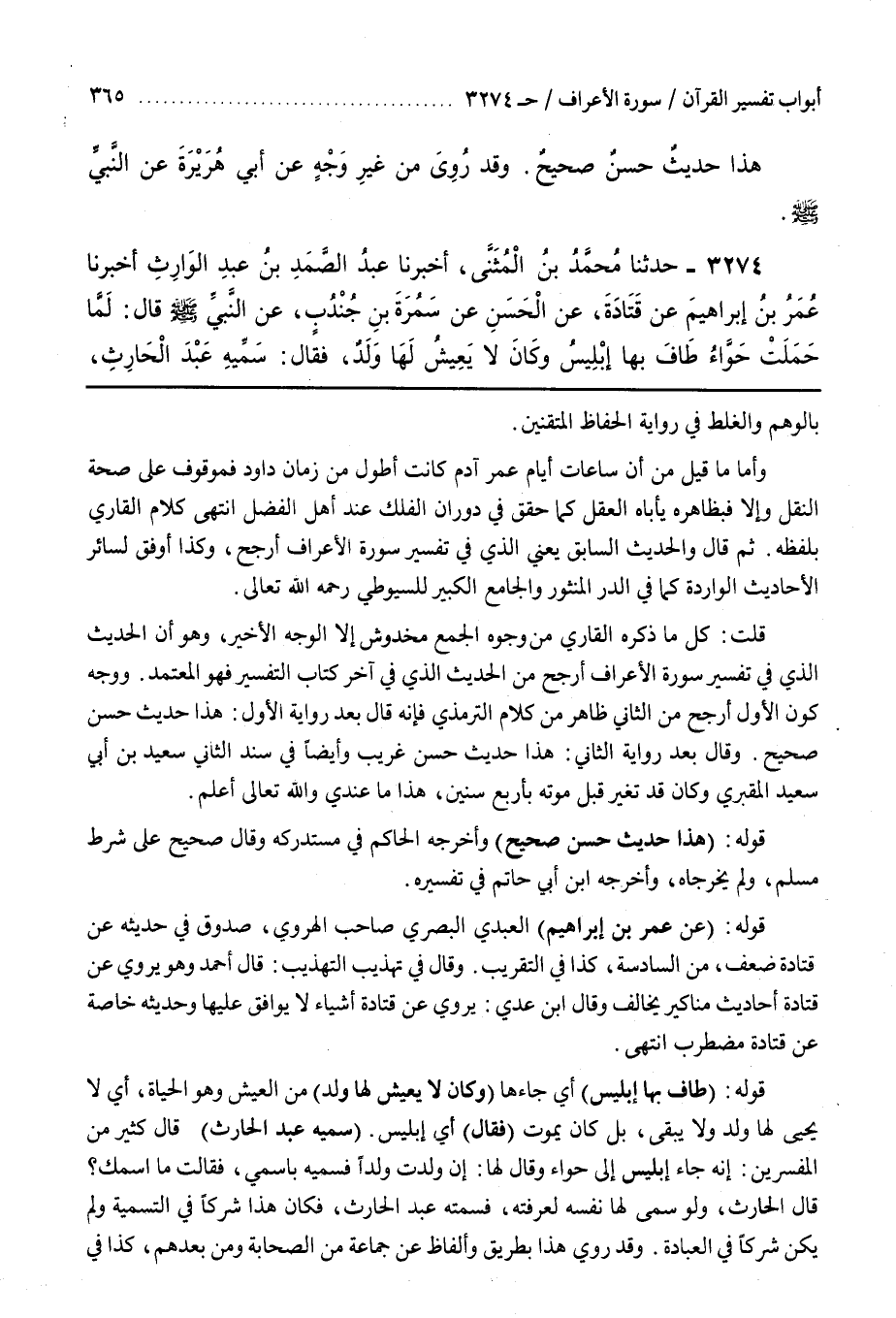 قلتَ كل ما ذكره القارىء مِنْ وُجُوهِ الْجَمْعِ مَخْدُوشٌ إِلَّا الْوَجْهَ الْأَخِيرَ وَهُوَ أَنَّ الْحَدِيثَ الَّذِي فِي تَفْسِيرِ سُوَرِهِ الْأَعْرَافِ أَرْجَحُ مِنَ الْحَدِيثِ الَّذِي فِي آخِرِ كِتَابِ التَّفْسِيرِ فَهُوَ الْمُعْتَمَدُ