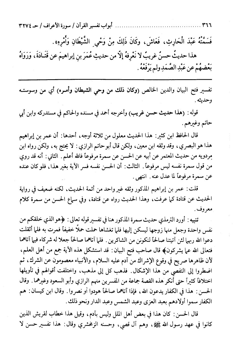 تَنْبِيهٌ أورد التِّرْمِذِيُّ حَدِيثَ سَمُرَةَ الْمَذْكُورَ هُنَا فِي تَفْسِيرِ قَوْلِهِ تَعَالَى هُوَ الَّذِي خَلَقَكُمْ مِنْ نَفْسٍ وَاحِدَةٍ وَجَعَلَ مِنْهَا زَوْجَهَا لِيَسْكُنَ إِلَيْهَا فَلَمَّا تَغَشَّاهَا حَمَلَتْ حَمْلًا خَفِيفًا فَمَرَّتْ بِهِ فَلَمَّا أَثْقَلَتْ دَعَوَا اللَّهَ رَبَّهُمَا لَئِنْ آتَيْتَنَا صَالِحًا لَنَكُونَنَّ مِنَ الشَّاكِرِينَ