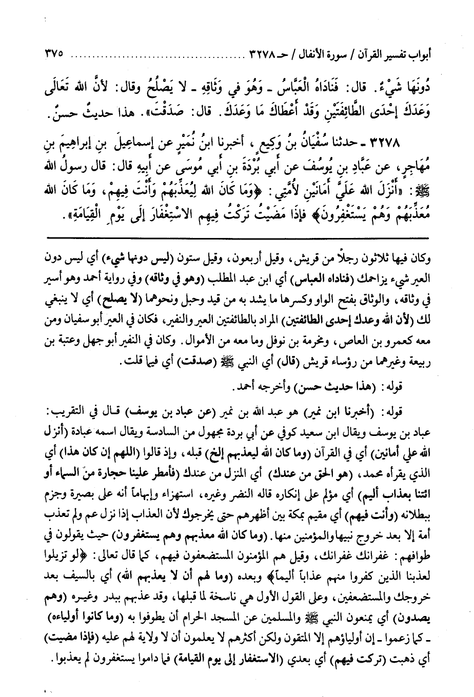 قوله (أخبرنا بن نُمَيْرٍ) هُوَ عَبْدُ اللَّهِ بْنُ نُمَيْرٍ (عَنْ عَبَّادِ بْنِ يُوسُفَ) قَالَ فِي التَّقْرِيبِ عباد بن يوسف ويقال بن سَعِيدٍ كُوفِيٌّ عَنْ أَبِي بُرْدَةَ مَجْهُولٌ مِنَ السَّادِسَةِ وَيُقَالُ اسْمُهُ عُبَادَةُ (أَنْزَلَ اللَّهُ عَلَيَّ أَمَانَيْنِ) أَيْ فِي الْقُرْآنِ وَمَا كَانَ اللَّهُ لِيُعَذِّبَهُمْ إِلَخْ قَبْلَهُ وَإِذْ قَالُوا اللَّهُمَّ إِنْ كان هذا أي الذي يقرأه مُحَمَّدٌ هُوَ الْحَقَّ مِنْ عِنْدِكَ أَيِ الْمُنَزَّلَ مِنْ عِنْدِكَ فَأَمْطِرْ عَلَيْنَا حِجَارَةً مِنَ السَّمَاءِ أو ائتنا بعذاب أليم أَيْ مُؤْلِمٍ عَلَى إِنْكَارِهِ قَالَهُ النَّضْرُ وَغَيْرُهُ اسْتِهْزَاءً وَإِيهَامًا أَنَّهُ عَلَى بَصِيرَةٍ وَجَزْمٍ بِبُطْلَانِهِ (وَأَنْتَ فِيهِمْ) أَيْ مُقِيمٌ بِمَكَّةَ بَيْنَ أَظْهُرِهِمْ حَتَّى يُخْرِجُوكَ لِأَنَّ الْعَذَابَ إِذَا نَزَلَ عَمَّ وَلَمْ تُعَذَّبْ أُمَّةٌ إِلَّا بَعْدَ خُرُوجِ نَبِيِّهَا وَالْمُؤْمِنُونَ مِنْهَا