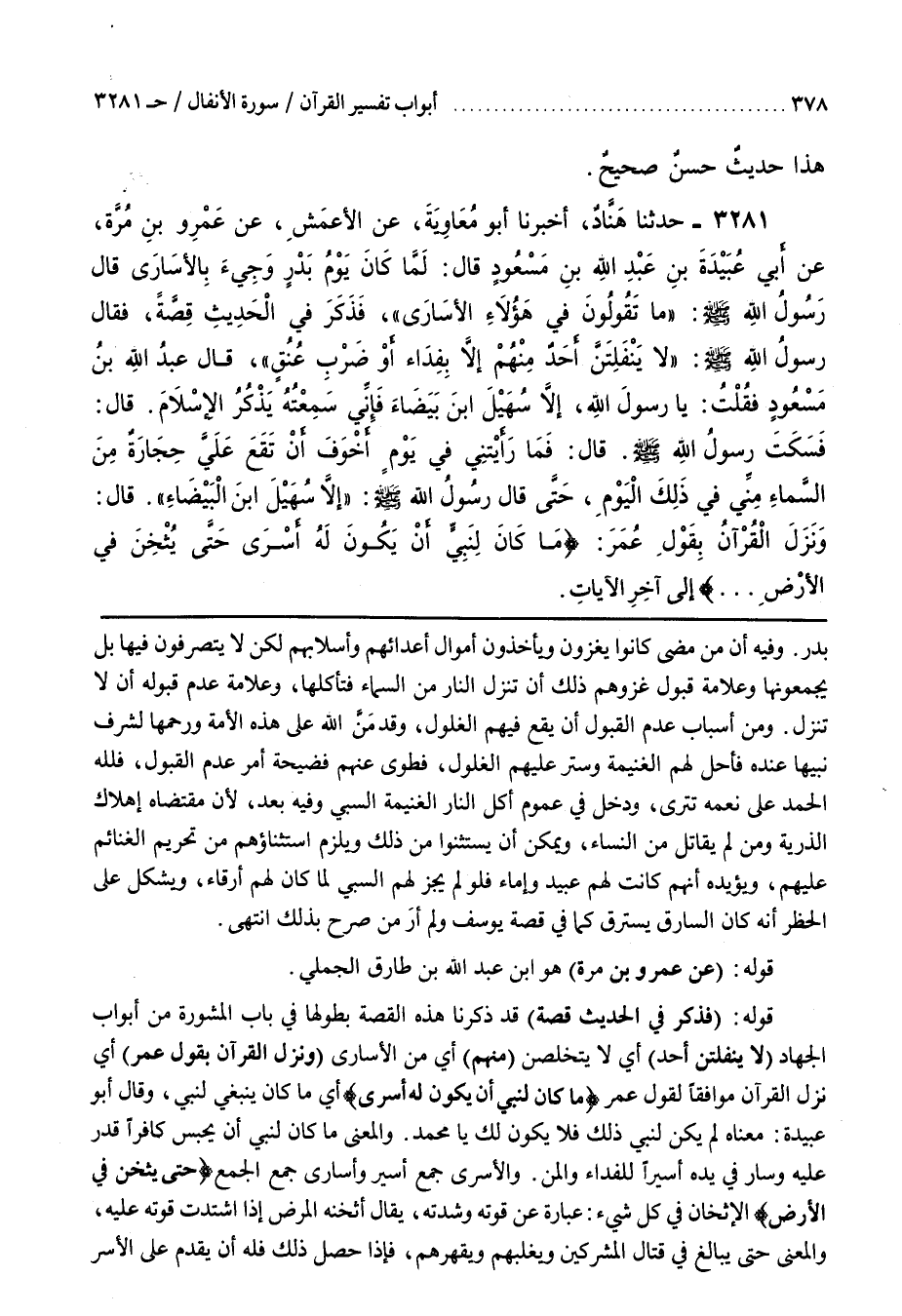 قَوْلُهُ (فَذَكَرَ فِي الْحَدِيثِ قِصَّةً) قَدْ ذَكَرْنَا هَذِهِ الْقِصَّةَ بِطُولِهَا فِي بَابِ الْمَشُورَةِ مِنْ أَبْوَابِ الْجِهَادِ (لَا يَنْفَلِتَنَّ أَحَدٌ) أَيْ لَا يَتَخَلَّصَنَّ (مِنْهُمْ) أَيْ مِنَ الْأُسَارَى (وَنَزَلَ الْقُرْآنُ بِقَوْلِ عُمَرَ) أَيْ نَزَلَ الْقُرْآنُ مُوَافِقًا لِقَوْلِ عُمَرَ مَا كَانَ لِنَبِيٍّ أَنْ يَكُونَ لَهُ أَسْرَى أَيْ مَا كَانَ يَنْبَغِي لِنَبِيٍّ وَقَالَ أَبُو عُبَيْدَةَ مَعْنَاهُ لَمْ يَكُنْ لِنَبِيٍّ ذَلِكَ فَلَا يَكُونُ لَكَ يَا مُحَمَّدُ