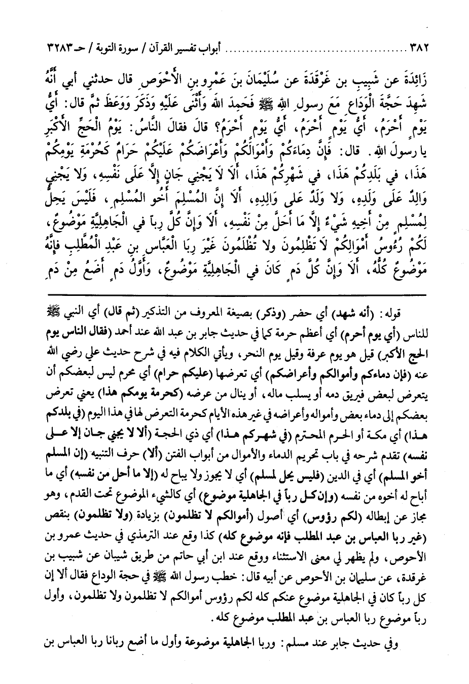 قَوْلُهُ (أَنَّهُ شَهِدَ) أَيْ حَضَرَ (وَذَكَّرَ) مِنَ التذكير (ثم قال) أي النبي لِلنَّاسِ أَيُّ يَوْمٍ أَحْرَمُ أَيْ أَعْظَمُ حُرْمَةً كَمَا فِي حَدِيثِ جَابِرِ بْنِ عَبْدِ اللَّهِ عند أحمد (فقال الناس يوم الحج الأكبر) قِيلَ هُوَ يَوْمُ عَرَفَةَ وَقِيلَ يَوْمُ النَّحْرِ وَيَأْتِي الْكَلَامُ فِيهِ فِي شَرْحِ حَدِيثِ عَلِيٍّ رَضِيَ اللَّهُ عَنْهُ فَإِنَّ دِمَاءَكُمْ وَأَمْوَالَكُمْ وَأَعْرَاضَكُمْ أَيْ تَعَرُّضُهَا عَلَيْكُمْ حَرَامٌ أَيْ مُحَرَّمٌ لَيْسَ لِبَعْضِكُمْ أَنْ يَتَعَرَّضَ لِبَعْضٍ فَيُرِيقَ دَمَهُ أَوْ يَسْلُبَ مَالَهُ أَوْ يَنَالَ مِنْ عِرْضِهِ كَحُرْمَةِ يَوْمِكُمْ هَذَا يَعْنِي تَعَرُّضَ بَعْضِكُمْ دِمَاءَ بَعْضٍ وَأَمْوَالِهِ وَأَعْرَاضِهِ فِي غَيْرِ هَذِهِ الْأَيَّامِ كَحُرْمَةِ التَّعَرُّضِ لَهَا فِي هَذَا الْيَوْمِ فِي بَلَدِكُمْ هَذَا أَيْ مَكَّةَ أَوِ الْحَرَمِ الْمُحْتَرَمِ فِي شَهْرِكُمْ هَذَا أَيْ ذِي الْحِجَّةِ أَلَا لَا يَجْنِي جَانٍ إِلَّا عَلَى نَفْسِهِ تَقَدَّمَ شَرْحُهُ فِي بَابِ تَحْرِيمِ الدِّمَاءِ وَالْأَمْوَالِ مِنْ أَبْوَابِ الْفِتَنِ أَلَا حَرْفُ التَّنْبِيهِ إِنَّ الْمُسْلِمَ أَخُو الْمُسْلِمِ أَيْ فِي الدِّينِ فَلَيْسَ يَحِلُّ لِمُسْلِمٍ أَيْ لَا يَجُوزُ وَلَا يُبَاحُ لَهُ إِلَّا مَا أَحَلَّ مِنْ نَفْسِهِ أَيْ مَا أَبَاحَ لَهُ أَخُوهُ مِنْ نَفْسِهِ وَإِنَّ كُلَّ رِبًا فِي الْجَاهِلِيَّةِ مَوْضُوعٌ أَيْ كَالشَّيْءِ الْمَوْضُوعِ تَحْتَ القدم وهو مجاز عن إبطاله لكم رؤوس أَيْ أُصُولُ أَمْوَالِكُمْ لَا تَظْلِمُونَ بِزِيَادَةٍ وَلَا تُظْلَمُونَ بِنَقْصٍ غَيْرَ رِبَا الْعَبَّاسِ بْنِ عَبْدِ الْمُطَّلِبِ فَإِنَّهُ مَوْضُوعٌ كُلُّهُ كَذَا وَقَعَ عِنْدَ التِّرْمِذِيِّ فِي حَدِيثِ عَمْرِو بْنِ الْأَحْوَصِ وَلَمْ يظهر لي معنى الاستثناء ووقع عند بن أَبِي حَاتِمٍ مِنْ طَرِيقِ شَيْبَانَ عَنْ شَبِيبِ بْنِ غَرْقَدَةَ عَنْ سُلَيْمَانَ بْنِ الْأَحْوَصِ عَنْ أبيه قال خطب رسول الله فِي حَجَّةِ الْوَدَاعِ فَقَالَ أَلَا إِنَّ كُلَّ رِبًا كَانَ فِي الْجَاهِلِيَّةِ مَوْضُوعٌ عَنْكُمْ كُلُّهُ لكم رؤوس أموالكم لا تظلمون ولا تظلمون وَأَوَّلُ رِبًا مَوْضُوعٍ رِبَا الْعَبَّاسِ بْنِ عَبْدِ الْمُطَّلِبِ مَوْضُوعٌ كُلُّهُ