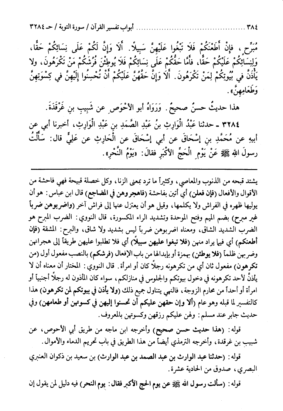 سَوَاءٌ كَانَ الْمَأْذُونُ لَهُ رَجُلًا أَجْنَبِيًّا أَوِ امْرَأَةً أَوْ أَحَدًا مِنْ مَحَارِمِ الزَّوْجَةِ فَالنَّهْيُ يَتَنَاوَلُ جَمِيعَ ذَلِكَ وَلَا يَأْذَنَّ فِي بُيُوتِكُمْ لِمَنْ تَكْرَهُونَ هَذَا كَالتَّفْسِيرِ لِمَا قَبْلَهُ وَهُوَ عَامٌّ (أَلَا وَإِنَّ حَقَّهُنَّ عَلَيْكُمْ أَنْ تُحْسِنُوا إِلَيْهِنَّ فِي كسوتهن أو طعامهن) وَفِي حَدِيثِ جَابِرٍ عِنْدَ مُسْلِمٍ وَلَهُنَّ عَلَيْكُمْ رِزْقُهُنَّ وَكِسْوَتُهُنَّ بِالْمَعْرُوفِ