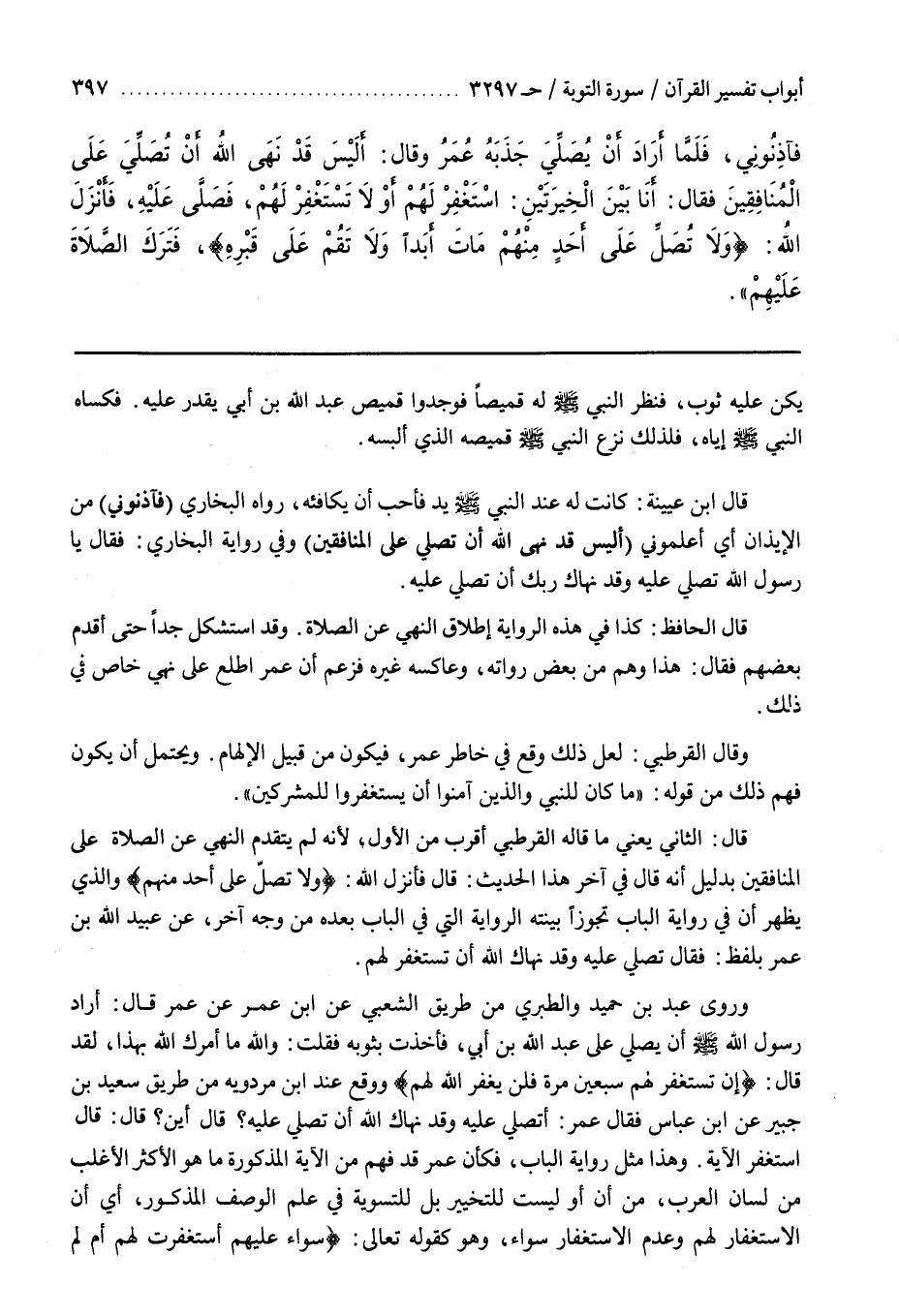 وَرَوَى عَبْدُ بْنُ حُمَيْدٍ والطبري من طريق الشعبي عن بن عُمَرَ عَنْ عُمَرَ قَالَ أَرَادَ رَسُولُ اللَّهِ أَنْ يُصَلِّيَ عَلَى عَبْدِ اللَّهِ بْنِ أُبَيٍّ فَأَخَذْتُ بِثَوْبِهِ فَقُلْتُ واللَّهِ مَا أَمَرَكَ اللَّهُ بِهَذَا لَقَدْ قَالَ إِنْ تَسْتَغْفِرْ لَهُمْ سَبْعِينَ مرة فلن يغفر الله لهم ووقع عند بن مَرْدَوَيْهِ مِنْ طَرِيقِ سَعِيدِ بْنِ جُبَيْرٍ عَنِ بن عَبَّاسٍ فَقَالَ عُمَرُ أَتُصَلِّي عَلَيْهِ وَقَدْ نَهَاكَ اللَّهُ أَنْ تُصَلِّيَ عَلَيْهِ قَالَ أَيْنَ قَالَ وقال اسْتَغْفِرْ الْآيَةَ
