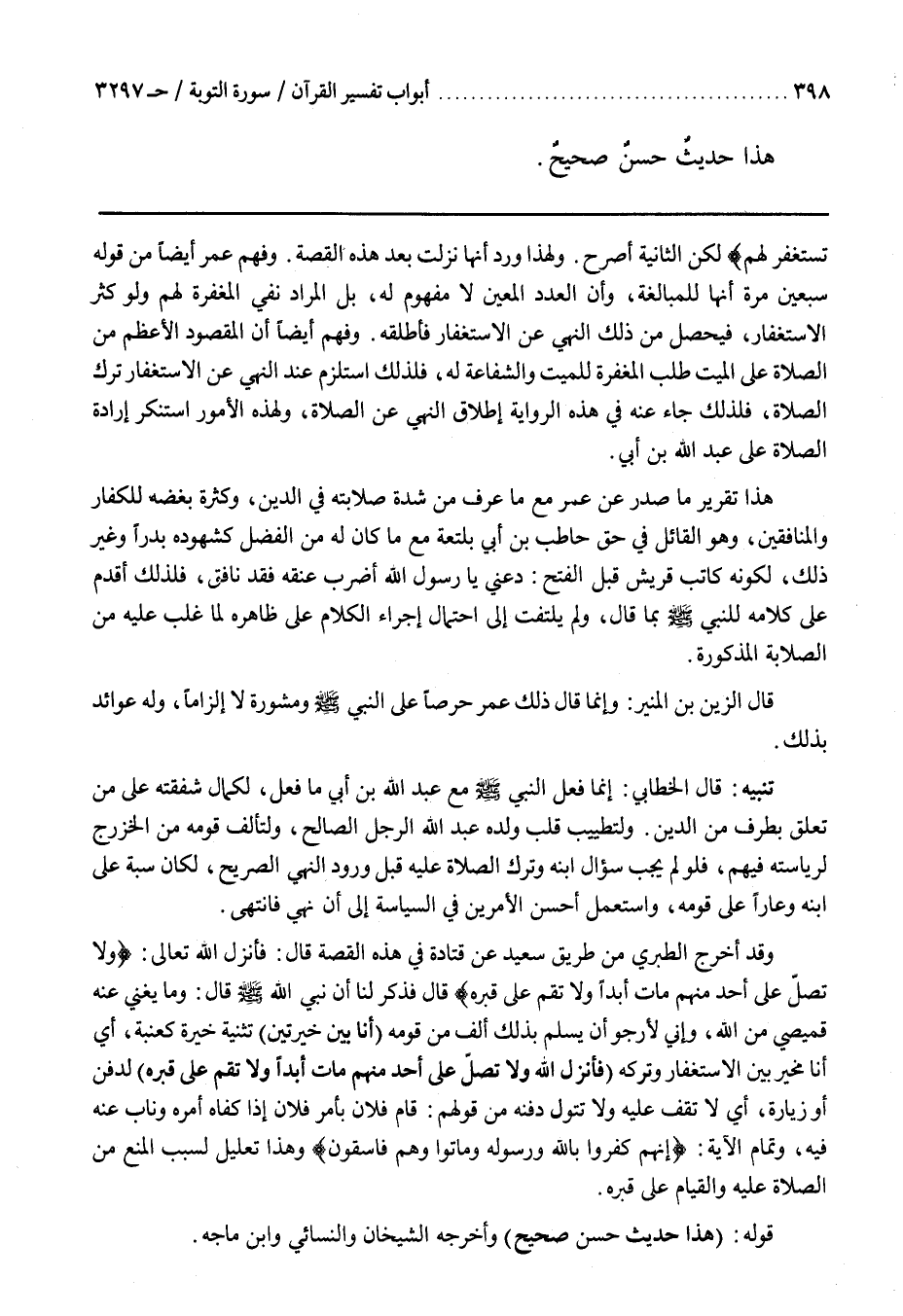 وَقَدْ أَخْرَجَ الطَّبَرِيُّ مِنْ طَرِيقِ سَعِيدٍ عَنْ قَتَادَةَ فِي هَذِهِ الْقِصَّةِ قَالَ فَأَنْزَلَ اللَّهُ تَعَالَى وَلَا تُصَلِّ عَلَى أَحَدٍ مِنْهُمْ مَاتَ أبدا ولا تقم على قبره قال فذكر لنا أن نبي الله قَالَ وَمَا يُغْنِي عَنْهُ قَمِيصِي مِنَ اللَّهِ وَإِنِّي لَأَرْجُو أَنْ يُسْلِمَ بِذَلِكَ أَلْفٌ مِنْ قَوْمِهِ (أَنَا بَيْنَ خِيرَتَيْنِ) تَثْنِيَةُ خِيَرَةٍ كَعِنَبَةٍ أَيْ أَنَا مُخَيَّرٌ بَيْنَ الِاسْتِغْفَارِ وَتَرْكِهِ (فَأَنْزَلَ اللَّهُ وَلَا تُصَلِّ عَلَى أَحَدٍ مِنْهُمْ مَاتَ أبدا ولا تقم على قبره) لِدَفْنٍ أَوْ زِيَارَةٍ أَيْ لَا تَقِفْ عَلَيْهِ وَلَا تَتَوَلَّ دَفْنَهُ مِنْ قَوْلِهِمْ قَامَ فُلَانٌ بِأَمْرِ فُلَانٍ إِذَا كَفَاهُ أَمْرَهُ وَنَابَ عَنْهُ فِيهِ وَتَمَامُ الْآيَةِ إِنَّهُمْ كَفَرُوا بِاَللَّهِ وَرَسُولِهِ وماتوا وهم فاسقون وَهَذَا تَعْلِيلٌ لِسَبَبِ الْمَنْعِ مِنَ الصَّلَاةِ عَلَيْهِ وَالْقِيَامِ عَلَى قَبْرِهِ