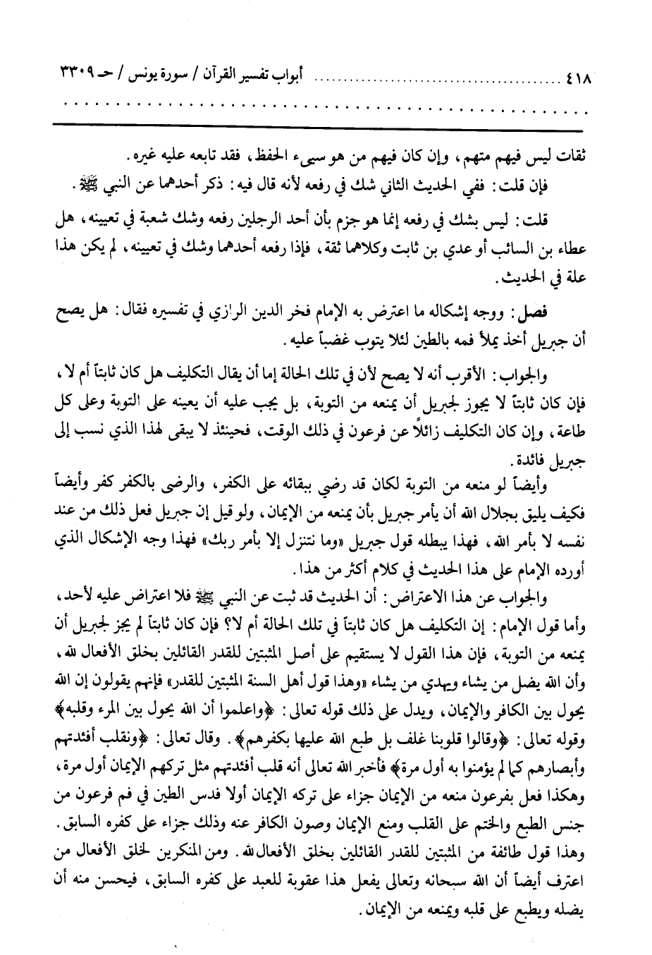 وَأَيْضًا لَوْ مَنَعَهُ مِنَ التَّوْبَةِ لَكَانَ قَدْ رَضِيَ بِبَقَائِهِ عَلَى الْكُفْرِ والرضى بِالْكُفْرِ كُفْرٌ وَأَيْضًا فَكَيْفَ يَلِيقُ بِجَلَالِ اللَّهِ أَنْ يَأْمُرَ جِبْرِيلَ بِأَنْ يَمْنَعَهُ مِنَ الْإِيمَانِ وَلَوْ قِيلَ إِنَّ جِبْرِيلَ فَعَلَ ذَلِكَ مِنْ عِنْدِ نَفْسِهِ لَا بِأَمْرِ اللَّهِ فَهَذَا يُبْطِلُهُ قَوْلُ جِبْرِيلَ وَمَا نَتَنَزَّلُ إِلَّا بِأَمْرِ رَبِّكَ فَهَذَا وَجْهُ الْإِشْكَالِ الَّذِي أَوْرَدَهُ الْإِمَامُ عَلَى هَذَا الْحَدِيثِ فِي كَلَامٍ أَكْثَرَ مِنْ هَذَا
