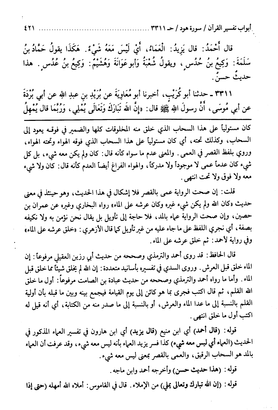 قُلْتُ إِنْ صَحَّتِ الرِّوَايَةُ عَمًى بِالْقَصْرِ فَلَا إِشْكَالَ فِي هَذَا الْحَدِيثِ وَهُوَ حِينَئِذٍ فِي مَعْنَى حَدِيثِ كَانَ اللَّهُ وَلَمْ يَكُنْ شَيْءٌ غَيْرُهُ وَكَانَ عَرْشُهُ عَلَى الْمَاءِ رَوَاهُ الْبُخَارِيُّ وَغَيْرُهُ عَنْ عِمْرَانَ بْنِ حُصَيْنٍ وَإِنْ صَحَّتِ الرِّوَايَةُ عَمَاءً بِالْمَدِّ فَلَا حَاجَةَ إِلَى تَأْوِيلٍ بَلْ يُقَالُ نَحْنُ نُؤْمِنُ بِهِ وَلَا نُكَيِّفُهُ بِصِفَةٍ أَيْ نُجْرِي اللَّفْظَ عَلَى مَا جَاءَ عَلَيْهِ مِنْ غَيْرِ تَأْوِيلٍ كَمَا قَالَ الْأَزْهَرِيُّ وَخَلَقَ عَرْشَهُ عَلَى الْمَاءِ وَفِي رِوَايَةِ أَحْمَدَ ثُمَّ خَلَقَ عَرْشَهُ عَلَى الْمَاءِ
