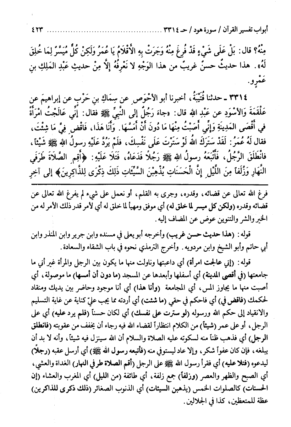 قَوْلُهُ (إِنِّي عَالَجْتُ امْرَأَةً) أَيْ دَاعَبْتُهَا وَنَاوَلْتُ مِنْهَا مَا يَكُونُ بَيْنَ الرَّجُلِ وَالْمَرْأَةِ غَيْرَ أَنِّي مَا جَامَعْتُهَا (فِي أَقْصَى الْمَدِينَةِ) أَيْ أَسْفَلِهَا وَأَبْعَدِهَا عَنِ الْمَسْجِدِ (مَا دُونَ أَنْ أَمَسَّهَا) مَا مَوْصُولَةٌ أَيْ أَصَبْتُ مِنْهَا مَا يُجَاوِزُ الْمَسَّ أَيِ الْمُجَامَعَةِ (وَأَنَا هَذَا) أَيْ أَنَا مَوْجُودٌ وَحَاضِرٌ بَيْنَ يَدَيْكَ وَمُنْقَادٌ لِحُكْمِكَ (فَاقْضِ فِيَّ) أَيْ فَاحْكُمْ فِي حَقِّي (مَا شِئْتَ) أَيْ أَرَدْتَهُ مِمَّا يَجِبُ عَلَيَّ كِنَايَةٌ عَنْ غَايَةِ التَّسْلِيمِ وَالِانْقِيَادِ إِلَى حُكْمِ اللَّهِ وَرَسُولِهِ (لَوْ سَتَرْتَ عَلَى نَفْسِكَ) أَيْ لَكَانَ حَسَنًا (فَلَمْ يَرُدَّ عَلَيْهِ) أَيْ عَلَى الرَّجُلِ أَوْ عَلَى عُمَرَ (شَيْئًا) مِنَ الْكَلَامِ انْتِظَارًا لِقَضَاءِ اللَّهِ فِيهِ رَجَاءَ أَنْ يُخَفِّفَ مِنْ عُقُوبَتِهِ (فَانْطَلَقَ الرَّجُلُ) أَيْ فَذَهَبَ ظَنًّا مِنْهُ لِسُكُوتِهِ عَلَيْهِ الصَّلَاةُ وَالسَّلَامُ أَنَّ اللَّهَ سَيُنْزِلُ فِيهِ شَيْئًا وَأَنَّهُ لَا بُدَّ أَنْ يُبَلِّغَهُ فَإِنْ كَانَ عَفْوًا شَكَرَ وَإِلَّا عَادَ لِيَسْتَوْفِيَ مِنْهُ (فَأَتْبَعَهُ رَسُولُ اللَّهِ صَلَّى اللَّهُ عَلَيْهِ وَسَلَّمَ) أَيْ أَرْسَلَ عَقِبَهُ (رَجُلًا) لِيَدْعُوَهُ (فَتَلَا عَلَيْهِ) أَيْ فَقَرَأَ رَسُولُ اللَّهِ صَلَّى اللَّهُ عَلَيْهِ وَسَلَّمَ عَلَى الرَّجُلِ (أَقِمُ الصَّلَاةَ طرفي النهار) الْغَدَاةَ وَالْعَشِيَّ أَيِ الصُّبْحَ وَالظُّهْرَ وَالْعَصْرَ (وَزُلَفًا) جَمْعُ زُلْفَةٍ أَيْ طَائِفَةً (مِنَ اللَّيْلِ) أَيِ الْمَغْرِبِ وَالْعِشَاءِ (إِنَّ الْحَسَنَاتِ) كَالصَّلَوَاتِ الْخَمْسِ (يُذْهِبْنَ السيئات) أي الذنوب الصغائر (ذلك ذكرى للذاكرين) عِظَةٌ لِلْمُتَّعِظِينَ كَذَا فِي الْجَلَالَيْنِ