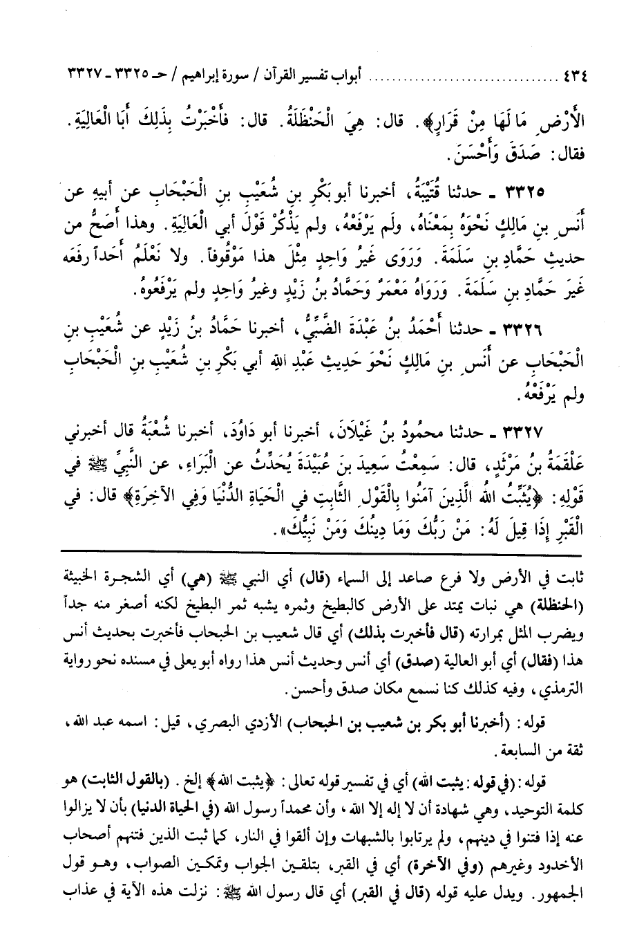 ثَابِتٌ فِي الْأَرْضِ وَلَا فَرْعٌ صَاعِدٌ إِلَى السَّمَاءِ (قَالَ) أَيِ النَّبِيُّ صَلَّى اللَّهُ عَلَيْهِ وَسَلَّمَ (هِيَ) أَيِ الشَّجَرَةُ الْخَبِيثَةُ (الْحَنْظَلَةُ) هِيَ نَبَاتٌ يَمْتَدُّ عَلَى الْأَرْضِ كَالْبِطِّيخِ وَثَمَرُهُ يُشْبِهُ ثَمَرَ الْبِطِّيخِ لَكِنَّهُ أَصْغَرُ مِنْهُ جِدًّا وَيُضْرَبُ الْمَثَلُ بِمَرَارَتِهِ (قَالَ فَأَخْبَرْتُ بِذَلِكَ) أَيْ قَالَ شعيب بن الحبحاب فأخبرت أنس هَذَا (فَقَالَ) أَيْ أَبُو الْعَالِيَةِ (صَدَقَ) أَيْ أَنَسٌ وَحَدِيثُ أَنَسٍ هَذَا رَوَاهُ أَبُو يَعْلَى فِي مُسْنَدِهِ نَحْوَ رِوَايَةِ