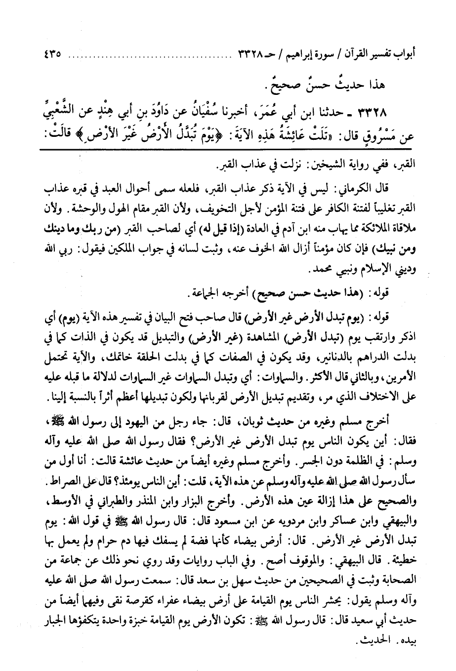 وَفِي الْبَابِ رِوَايَاتٌ وَقَدْ رُوِيَ نَحْوُ ذَلِكَ عَنْ جَمَاعَةٍ مِنَ الصَّحَابَةِ وَثَبَتَ فِي الصَّحِيحَيْنِ مِنْ حَدِيثِ سَهْلِ بْنِ سَعْدٍ قَالَ سَمِعْتُ رَسُولَ اللَّهِ صَلَّى اللَّهُ عَلَيْهِ وسلم وَآلِهِ وَسَلَّمَ يَقُولُ يُحْشَرُ النَّاسُ يَوْمَ الْقِيَامَةِ عَلَى أَرْضٍ بَيْضَاءَ عَفْرَاءَ كَقُرْصَةِ نَقِيٍّ وَفِيهِمَا أَيْضًا مِنْ حَدِيثِ أَبِي سَعِيدٍ قَالَ قَالَ رَسُولُ اللَّهِ صَلَّى اللَّهُ عَلَيْهِ وَسَلَّمَ تَكُونُ الْأَرْضُ يَوْمَ الْقِيَامَةِ خُبْزَةً وَاحِدَةً يَتَكَفَّؤُهَا الْجَبَّارُ بيده