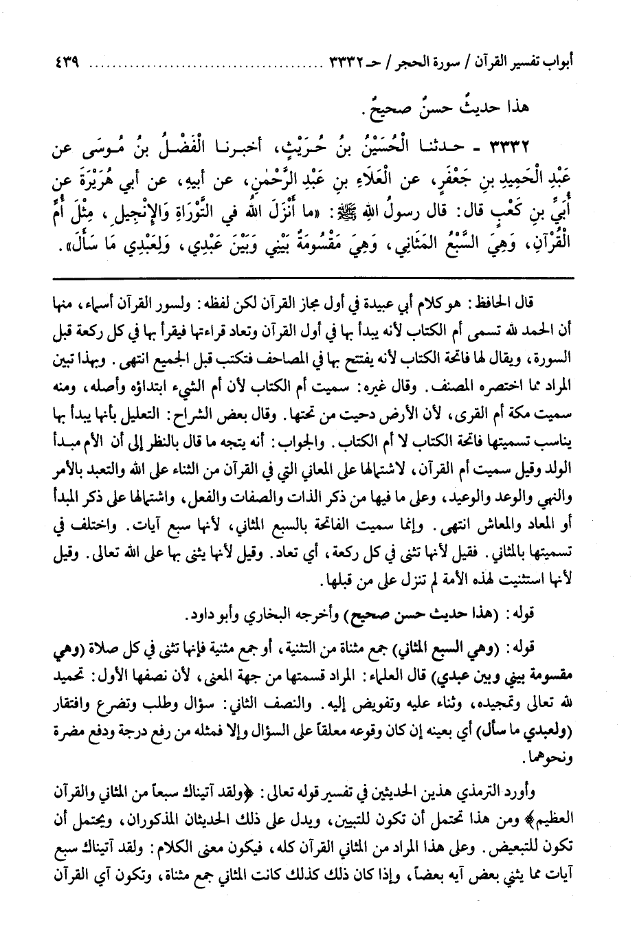 وَأَوْرَدَ التِّرْمِذِيُّ هَذَيْنِ الْحَدِيثَيْنِ فِي تَفْسِيرِ قَوْلِهِ تَعَالَى وَلَقَدْ آتَيْنَاكَ سَبْعًا مِنَ الْمَثَانِي وَالْقُرْآنَ العظيم وَمِنْ هَذِهِ تَحْتَمِلُ أَنْ تَكُونَ لِلتَّبْيِينِ وَيَدُلُّ عَلَى ذَلِكَ الْحَدِيثَانِ الْمَذْكُورَانِ وَيَحْتَمِلُ أَنْ تَكُونَ لِلتَّبْعِيضِ