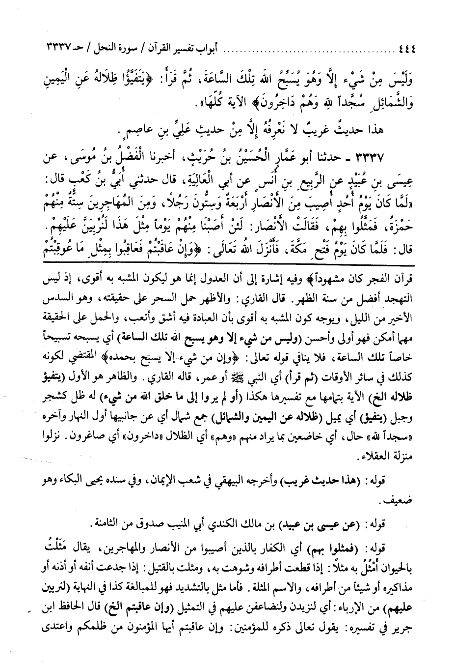 قال القارىء وَالْأَظْهَرُ حَمْلُ السَّحَرِ عَلَى حَقِيقَتِهِ وَهُوَ السُّدُسُ الْأَخِيرُ مِنَ اللَّيْلِ وَيُوَجَّهُ كَوْنُ الْمُشَبَّهِ بِهِ أَقْوَى بِأَنَّ الْعِبَادَةَ فِيهِ أَشَقُّ وَأَتْعَبُ وَالْحَمْلُ عَلَى الْحَقِيقَةِ مَهْمَا أَمْكَنَ فَهُوَ أَوْلَى وَأَحْسَنُ (وَلَيْسَ مِنْ شَيْءٍ إِلَّا وَهُوَ يُسَبِّحُ اللَّهَ تِلْكَ السَّاعَةِ) أَيْ يُسَبِّحُهُ تَسْبِيحًا خَاصًّا تِلْكَ السَّاعَةِ فَلَا يُنَافِي قَوْلَهُ تَعَالَى وَإِنْ مِنْ شَيْءٍ إِلَّا يُسَبِّحُ بِحَمْدِهِ لمقتضي لِكَوْنِهِ كَذَلِكَ فِي سَائِرِ الْأَوْقَاتِ (ثُمَّ قَرَأَ) أَيِ النَّبِيُّ صَلَّى اللَّهُ عَلَيْهِ وَسَلَّمَ أَوْ عمر قاله القارىء والظاهر هو الأول (يتفيؤ ظِلَالُهُ إِلَخِ) الْآيَةُ بِتَمَامِهَا مَعَ تَفْسِيرِهَا هَكَذَا (أو لم يَرَوْا إِلَى مَا خَلَقَ اللَّهُ مِنْ شَيْءٍ) له ظل كشجر وجبل (يتفيؤ) أَيْ يَمِيلُ (ظِلَالُهُ عَنِ الْيَمِينِ وَالشَّمَائِلِ) جَمْعُ شَمْلٍ أَيْ عَنْ جَانِبَيْهَا أَوَّلَ النَّهَارِ وَآخِرَهُ سُجَّدًا لِلَّهِ حَالٌ أَيْ خَاضِعِينَ بِمَا يُرَادُ مِنْهُمْ وَهُمْ أَيِ الظِّلَالُ دَاخِرُونَ أَيْ صَاغِرُونَ