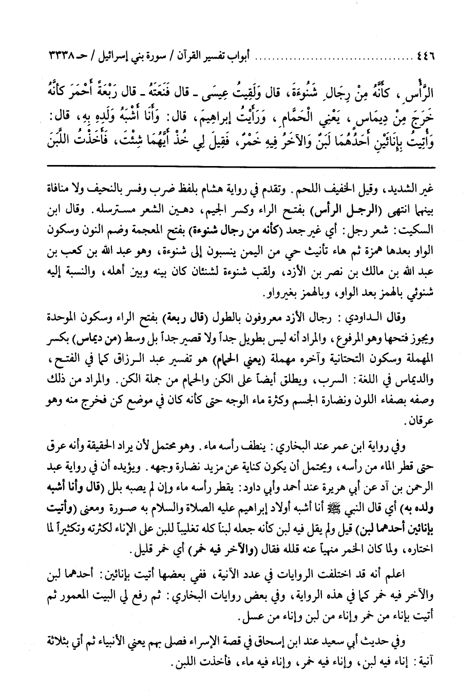 وَيُؤَيِّدُهُ أَنَّ فِي رِوَايَةِ عَبْدِ الرَّحْمَنِ بْنِ آدٍ عَنْ أَبِي هُرَيْرَةَ عِنْدَ أَحْمَدَ وَأَبِي دَاوُدَ يَقْطُرُ رَأْسُهُ مَاءً وَإِنْ لَمْ يُصِبْهُ بَلَلٌ (قَالَ وَأَنَا أَشْبَهُ وَلَدِهِ بِهِ) أَيْ قَالَ النَّبِيُّ أنا أشبه أولاد إبراهيم عليه الصلاة والسلام به صورة ومعنى (وأتيت بإنائين أَحَدُهُمَا لَبَنٌ) قِيلَ وَلَمْ يَقُلْ فِيهِ لَبَنٌ كَأَنَّهُ جَعَلَهُ لَبَنًا كُلَّهُ تَغْلِيبًا لِلَّبَنِ عَلَى الْإِنَاءِ لِكَثْرَتِهِ وَتَكْثِيرًا لِمَا اخْتَارَهُ وَلَمَّا كَانَ الْخَمْرُ مَنْهِيًّا عَنْهُ قَلَّلَهُ فَقَالَ (وَالْآخَرُ فِيهِ خَمْرٌ) أَيْ خَمْرٌ قَلِيلٌ