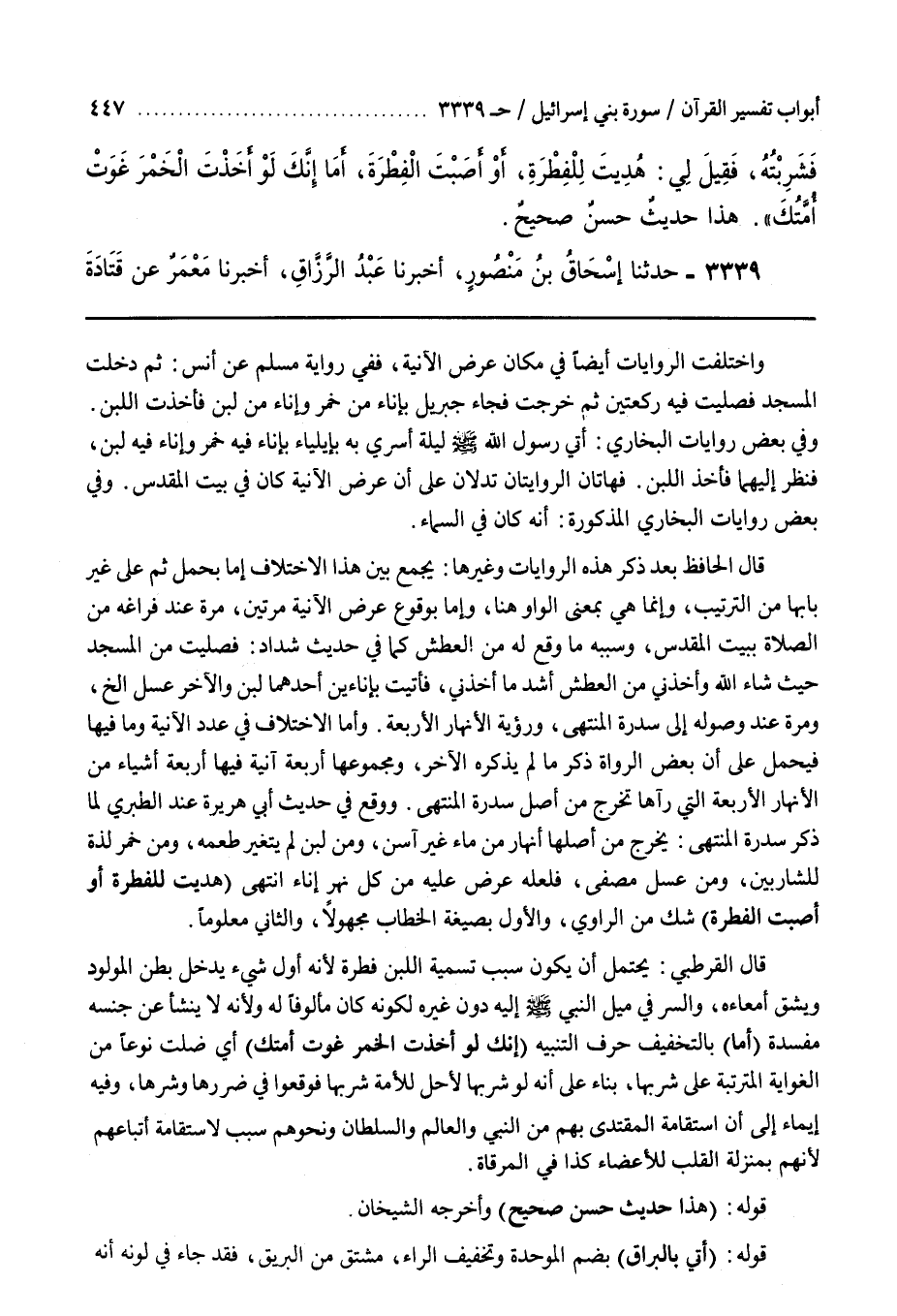 وَوَقَعَ فِي حَدِيثِ أَبِي هُرَيْرَةَ عِنْدَ الطَّبَرِيِّ لَمَّا ذَكَرَ سِدْرَةَ الْمُنْتَهَى يَخْرُجُ مِنْ أَصْلِهَا أَنْهَارٌ مِنْ مَاءٍ غَيْرِ آسِنٍ وَمِنْ لَبَنٍ لَمْ يَتَغَيَّرْ طَعْمُهُ وَمِنْ خَمْرٍ لَذَّةٍ لِلشَّارِبِينَ وَمِنْ عَسَلٍ مُصَفًّى فَلَعَلَّهُ عُرِضَ عَلَيْهِ مِنْ كُلِّ نَهْرٍ إِنَاءٌ انْتَهَى (هُدِيتَ لِلْفِطْرَةِ أَوْ أَصَبْتَ الْفِطْرَةَ) شَكٌّ مِنَ الرَّاوِي وَالْأَوَّلُ بِصِيغَةِ الْخِطَابِ مَجْهُولًا وَالثَّانِي مَعْلُومًا