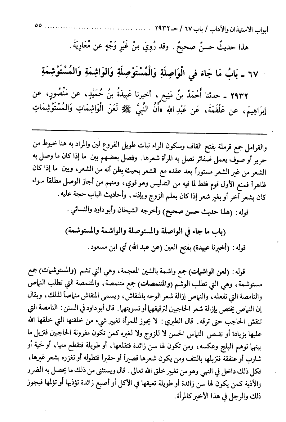 قَوْلُهُ (لَعَنَ الْوَاشِمَاتِ) جَمْعُ وَاشِمَةٍ بِالشِّينِ المعجمة وهي التي تشم (والمستوشمات) جمع مُسْتَوْشِمَةٍ وَهِيَ الَّتِي تَطْلُبُ الْوَشْمَ (وَالْمُتَنَمِّصَاتِ) جَمْعُ مُتَنَمِّصَةٍ وَالْمُتَنَمِّصَةُ الَّتِي تَطْلُبُ النِّمَاصَ وَالنَّامِصَةُ الَّتِي تَفْعَلُهُ وَالنِّمَاصُ إِزَالَةُ شَعْرِ الْوَجْهِ بِالْمِنْقَاشِ وَيُسَمَّى الْمِنْقَاشُ مِنْمَاصًا لِذَلِكَ وَيُقَالُ إِنَّ النِّمَاصَ يَخْتَصُّ بِإِزَالَةِ شَعْرِ الْحَاجِبَيْنِ لِتَرْقِيقِهِمَا أَوْ تَسْوِيَتِهِمَا