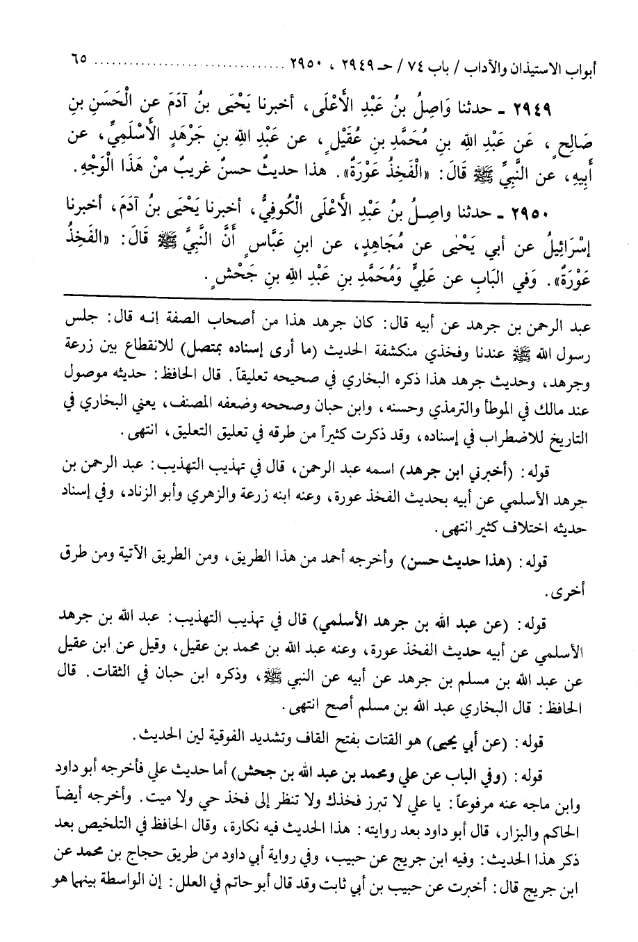 عَبْدِ الرَّحْمَنِ بْنِ جَرْهَدٍ عَنْ أَبِيهِ قَالَ كَانَ جَرْهَدٌ هَذَا مِنْ أَصْحَابِ الصُّفَّةِ إِنَّهُ قَالَ جَلَسَ رَسُولُ اللَّهِ صَلَّى اللَّهُ عَلَيْهِ وَسَلَّمَ عِنْدَنَا وَفَخِذِي مُنْكَشِفَةٌ الْحَدِيثَ (مَا أَرَى إِسْنَادَهُ بِمُتَّصِلٍ) لِلِانْقِطَاعِ بَيْنَ زُرْعَةَ وَجَرْهَدٍ وَحَدِيثُ جَرْهَدٍ هَذَا ذَكَرَهُ الْبُخَارِيُّ فِي صَحِيحِهِ تَعْلِيقًا قَالَ الْحَافِظُ حَدِيثُهُ مَوْصُولٌ عِنْدَ مَالِكٍ فِي الموطأ والترمذي وحسنه وبن حِبَّانَ وَصَحَّحَهُ وَضَعَّفَهُ الْمُصَنِّفُ يَعْنِي الْبُخَارِيَّ فِي التَّارِيخِ لِلِاضْطِرَابِ فِي إِسْنَادِهِ وَقَدْ ذَكَرْتَ كَثِيرًا مِنْ طُرُقِهِ فِي تَعْلِيقِ التَّعْلِيقِ انْتَهَى