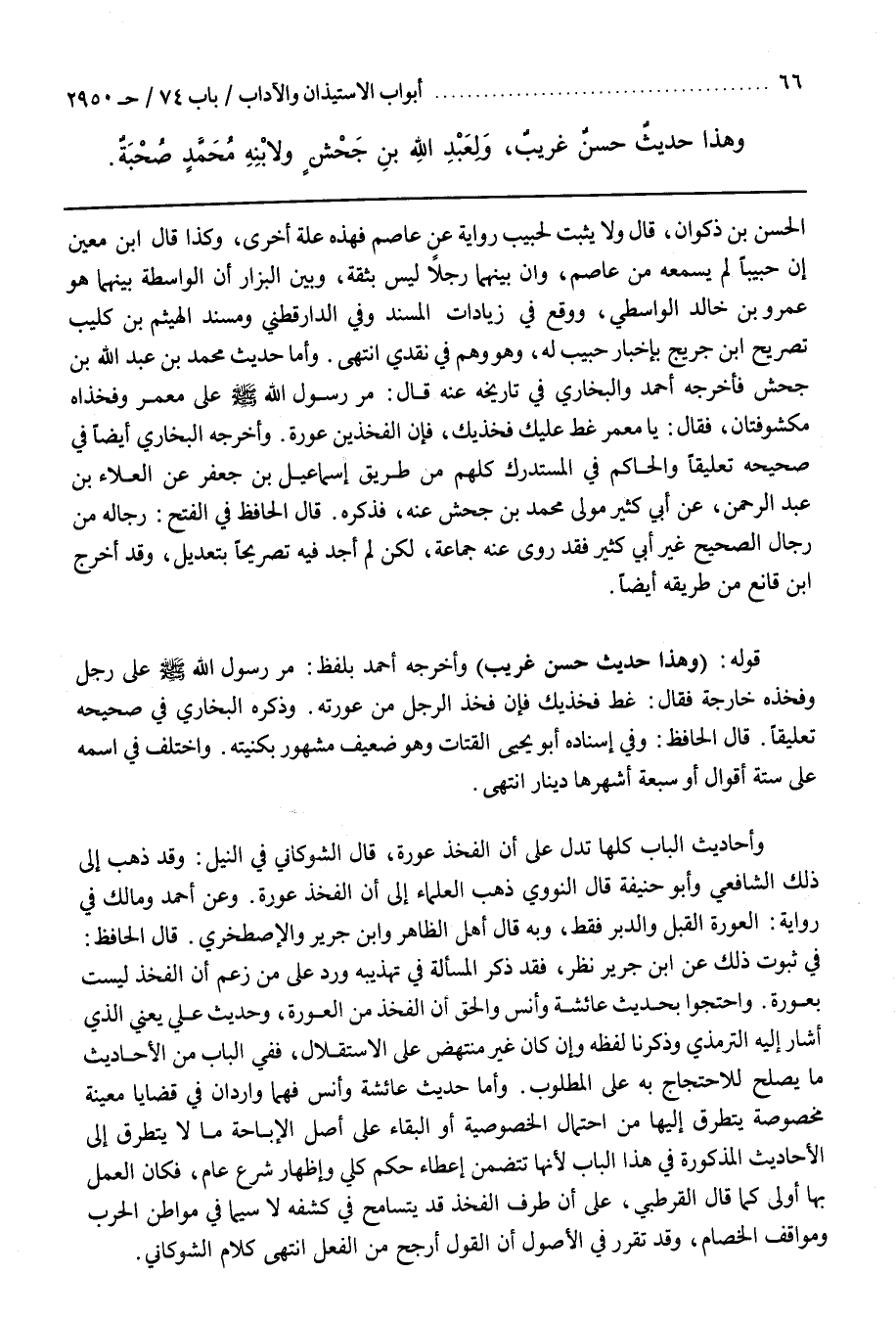 فَإِنَّ الْفَخِذَيْنِ عَوْرَةٌ وَأَخْرَجَهُ الْبُخَارِيُّ أَيْضًا فِي صَحِيحِهِ تَعْلِيقًا وَالْحَاكِمُ فِي الْمُسْتَدْرَكِ كُلُّهُمْ مِنْ طَرِيقِ إِسْمَاعِيلَ بْنِ جَعْفَرٍ عَنِ الْعَلَاءِ بْنِ عَبْدِ الرَّحْمَنِ عَنْ أَبِي كَثِيرٍ مَوْلَى مُحَمَّدِ بْنِ جَحْشٍ عَنْهُ فَذَكَرَهُ