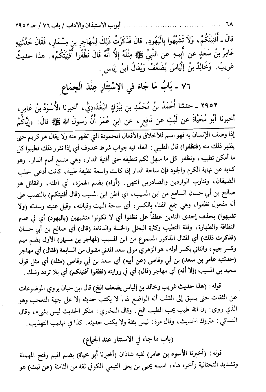 (أُرَاهُ) بِضَمِّ الْهَمْزَةِ أَيْ أَظُنُّهُ وَالْقَائِلُ هُوَ صَالِحُ بْنُ أَبِي حَسَّانَ السَّامِعُ من بن المسيب أي أظن بن الْمُسَيَّبِ (قَالَ أَفْنِيَتَكُمْ) بِالنَّصْبِ عَلَى أَنَّهُ مَفْعُولُ نَظِّفُوا وَهِيَ جَمْعُ الْفِنَاءِ بِالْكَسْرِ أَيْ سَاحَةُ الْبَيْتِ وَقُبَالَتُهُ وَقِيلَ عَتَبَتُهُ وَسُدَّتُهُ (وَلَا تَشَبَّهُوا) بِحَذْفِ إِحْدَى التَّاءَيْنِ عَطْفًا أَيْ لَا تَكُونُوا مُتَشَبِّهِينَ (بِالْيَهُودِ) أَيْ فِي عَدَمِ النَّظَافَةِ وَالطَّهَارَةِ وَقِلَّةِ التَّطَيُّبِ وَكَثْرَةِ الْبُخْلِ وَالْخِسَّةِ وَالدَّنَاءَةِ (قَالَ) أَيْ صَالِحُ بْنُ أَبِي حَسَّانَ (فَذَكَرْتُ ذَلِكَ) أي المقال المذكور المسموع من بن الْمُسَيَّبِ (لِمُهَاجِرِ بْنِ مِسْمَارٍ) الْأَوَّلُ بِضَمِّ مِيمٍ وَكَسْرِ جِيمٍ وَالثَّانِي بِكَسْرِ أَوَّلِهِ هُوَ الزُّهْرِيُّ مَوْلَى سَعْدٍ الْمَدَنِيُّ مَقْبُولٌ مِنَ السَّابِعَةِ (فَقَالَ) أَيْ مُهَاجِرٌ (حَدَّثَنِيهِ عَامِرُ بْنِ سَعْدِ) بْنِ أَبِي وَقَّاصٍ (عَنْ أَبِيهِ) أَيْ سَعْدِ بْنِ أَبِي وَقَّاصٍ (مِثْلَهُ) أَيْ مِثْلَ قَوْلِ سَعِيدِ بْنِ الْمُسَيَّبِ (إِلَّا أَنَّهُ) أَيْ مُهَاجِرًا (قَالَ) أَيْ فِي رِوَايَتِهِ (نَظِّفُوا أَفْنِيَتَكُمْ) أَيْ بِلَا تَرَدُّدٍ وَشَكٍّ