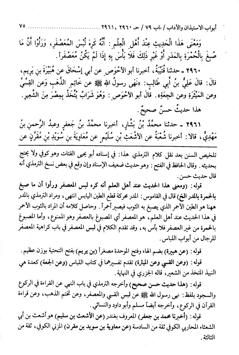 قَوْلُهُ (هَذَا حَدِيثٌ حَسَنٌ صَحِيحٌ) وَأَخْرَجَهُ التِّرْمِذِيُّ فِي بَابِ النَّهْيِ عَنِ الْقِرَاءَةِ فِي الرُّكُوعِ وَالسُّجُودِ بِلَفْظِ نَهَى رَسُولُ اللَّهِ صَلَّى اللَّهُ عَلَيْهِ وَسَلَّمَ عَنْ لُبْسِ الْقِسِيِّ وَالْمُعَصْفَرِ وَعَنْ تَخَتُّمِ الذَّهَبِ وَعَنْ قِرَاءَةِ الْقُرْآنِ فِي الرُّكُوعِ وَأَخْرَجَهُ أَيْضًا مُسْلِمٌ وَأَبُو دَاوُدَ وَالنَّسَائِيُّ