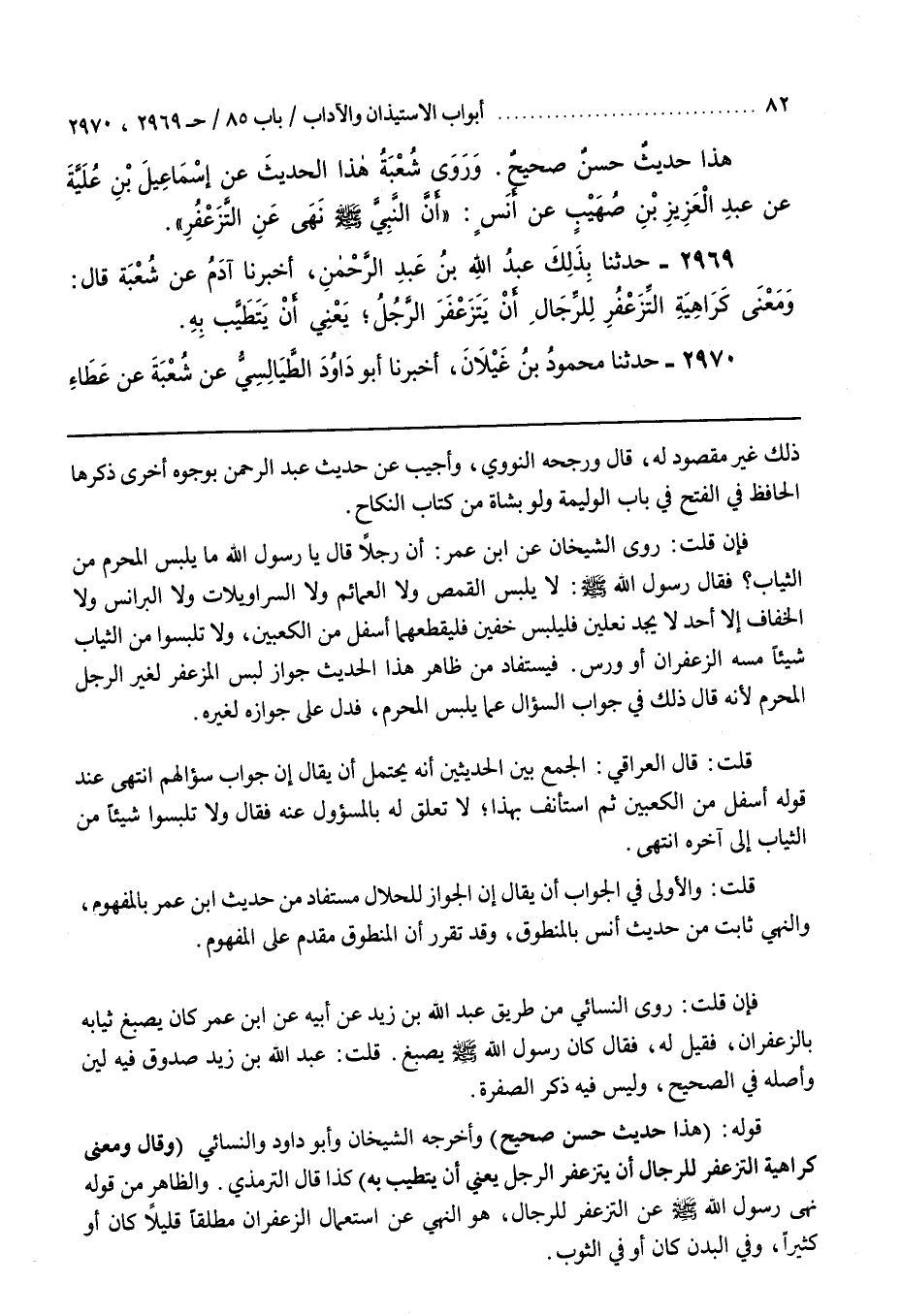 قَوْلُهُ (هَذَا حَدِيثٌ حَسَنٌ صَحِيحٌ) وَأَخْرَجَهُ الشَّيْخَانِ وَأَبُو دَاوُدَ وَالنَّسَائِيُّ (قَالَ وَمَعْنَى كَرَاهِيَةِ التَّزَعْفُرِ لِلرِّجَالِ أَنْ يَتَزَعْفَرَ الرَّجُلُ يَعْنِي أَنْ يَتَطَيَّبَ بِهِ) كَذَا قَالَ التِّرْمِذِيُّ