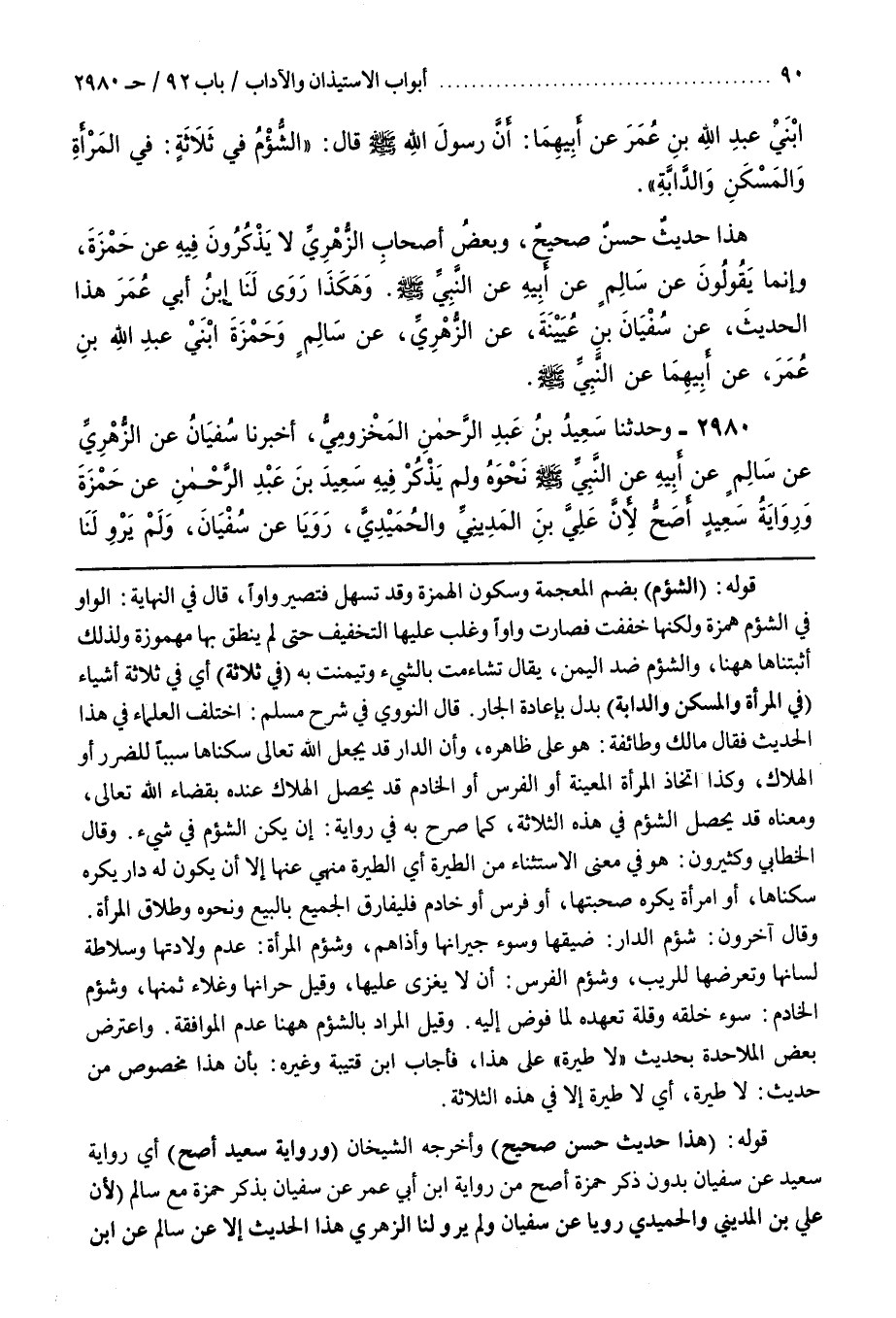 قَوْلُهُ (هَذَا حَدِيثٌ حَسَنٌ صَحِيحٌ) وَأَخْرَجَهُ الشَّيْخَانِ (وَرِوَايَةُ سَعِيدٍ أَصَحُّ) أَيْ رِوَايَةُ سَعِيدٍ عَنْ سُفْيَانَ بِدُونِ ذِكْرِ حَمْزَةَ أَصَحُّ من رواية بن أَبِي عُمَرَ عَنْ سُفْيَانَ بِذِكْرِ حَمْزَةَ مَعَ سَالِمٍ (لِأَنَّ عَلِيَّ بْنَ الْمَدِينِيِّ وَالْحُمَيْدِيَّ رَوَيَا عَنْ سُفْيَانَ وَلَمْ يَرْوِ لَنَا الزُّهْرِيُّ هَذَا الحديث إلا عن سالم عن بن