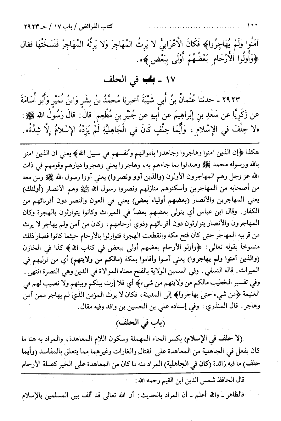 [2925] (لَا حِلْفَ فِي الْإِسْلَامِ) بِكَسْرِ الْحَاءِ الْمُهْمَلَةِ وَسُكُونِ اللَّامِ الْمُعَاهَدَةُ وَالْمُرَادُ بِهِ هُنَا مَا كَانَ يُفْعَلُ فِي الْجَاهِلِيَّةِ مِنَ الْمُعَاهَدَةِ عَلَى الْقِتَالِ وَالْغَارَاتِ وَغَيْرِهِمَا مِمَّا يَتَعَلَّقُ بِالْمَفَاسِدِ (وَأَيّمَا حِلْفٍ) مَا فِيهِ زَائِدَةٌ (كَانَ فِي الْجَاهِلِيَّةِ) الْمُرَادُ مِنْهُ مَا كَانَ مِنَ الْمُعَاهَدَةِ عَلَى الْخَيْرِ كَصِلَةِ الأرحام