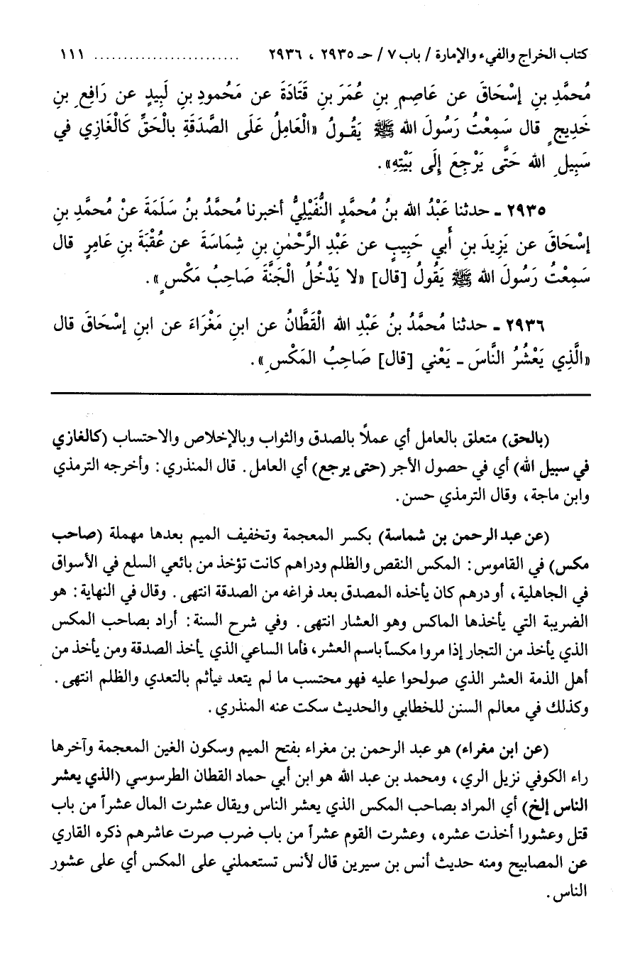 [2938] (عن بن مَغْرَاءَ) هُوَ عَبْدُ الرَّحْمَنِ بْنِ مَغْرَاءَ بِفَتْحِ الْمِيمِ وَسُكُونِ الْغَيْنِ الْمُعْجَمَةِ وَآخِرُهَا رَاءٌ الْكُوفِيُّ نَزِيلُ الرَّيِّ وَمُحَمَّدُ بْنُ عَبْدِ اللَّهِ هُوَ بن أَبِي حَمَّادٍ الْقَطَّانُ الطُّرْسُوسِيُّ (الَّذِي يَعْشُرُ النَّاسَ إِلَخْ) أَيْ الْمُرَادُ بِصَاحِبِ الْمَكْسِ الَّذِي يَعْشُرُ النَّاسَ وَيُقَالُ عَشَرْتُ الْمَالَ عَشْرًا مِنْ بَابِ قَتَلَ وَعُشُورًا أَخَذْتُ عُشْرَهُ وَعَشَرْتُ الْقَوْمَ عَشْرًا من باب ضرب صرت عاشرهم ذكره القارىء عَنِ الْمَصَابِيحِ وَمِنْهُ حَدِيثُ أَنَسِ بْنِ سِيرِينَ قَالَ لِأَنَسٍ تَسْتَعْمِلُنِي عَلَى الْمَكْسِ أَيْ عَلَى عشور الناس