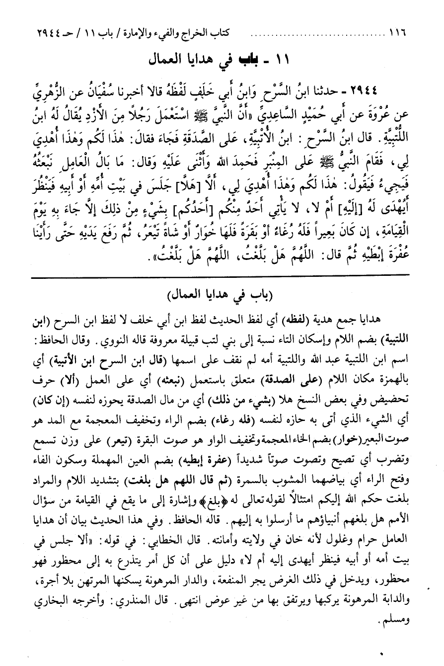 وَقَالَ الحافظ اسم بن اللُّتْبِيَّةِ عَبْدُ اللَّهِ وَاللُّتْبِيَّةُ أُمُّهُ لَمْ نَقِفْ على اسمها (قال بن السرح بن الْأُتْبِيَّةِ) أَيْ بِالْهَمْزَةِ مَكَانَ اللَّامِ (عَلَى الصَّدَقَةِ) مُتَعَلِّقٌ بِاسْتَعْمَلَ (نَبْعَثُهُ) أَيْ عَلَى الْعَمَلِ (أَلَّا) حَرْفُ تَحْضِيضٍ وَفِي بَعْضِ النُّسَخِ هَلَّا (بِشَيْءٍ مِنْ ذَلِكَ) أَيْ مِنْ مَالِ الصَّدَقَةِ يَحُوزُهُ لِنَفْسِهِ (إِنْ كَانَ) أَيِ الشَّيْءُ الَّذِي أَتَى بِهِ حَازَهُ لِنَفْسِهِ (فَلَهُ رُغَاءٌ) بِضَمِّ الرَّاءِ وَتَخْفِيفِ الْمُعْجَمَةِ مَعَ الْمَدِّ هُوَ صَوْتُ الْبَعِيرِ (خُوَارٌ) بِضَمِّ الْخَاءِ الْمُعْجَمَةِ وَتَخْفِيفِ الْوَاوِ هُوَ صَوْتُ الْبَقَرَةِ (تَيْعَرُ) عَلَى وَزْنِ تَسْمَعُ وَتَضْرِبُ أَيْ تَصِيحُ وَتُصَوِّتُ صَوْتًا شَدِيدًا (عُفْرَةُ إِبْطَيْهِ) بِضَمِّ الْعَيْنِ الْمُهْمَلَةِ وَسُكُونِ الْفَاءِ وَفَتْحِ الرَّاءِ أَيْ بَيَاضُهُمَا الْمَشُوبُ بِالسُّمْرَةِ (ثُمَّ قَالَ اللَّهُمَّ هَلْ بَلَّغْتُ) بِتَشْدِيدِ اللَّامِ وَالْمُرَادُ بَلَّغْتُ حُكْمَ اللَّهِ إِلَيْكُمُ امْتِثَالًا لِقَوْلِهِ تَعَالَى لَهُ (بَلِّغْ) وَإِشَارَةً إِلَى مَا يَقَعُ فِي الْقِيَامَةِ مِنْ سُؤَالِ الْأُمَمِ هَلْ بَلَّغَهُمْ أَنْبِيَاؤُهُمْ مَا أُرْسِلُوا بِهِ إِلَيْهِمْ