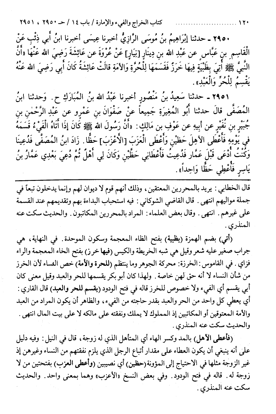 فِي الْقَامُوسِ الْخَرَزَةُ مُحَرَّكَةٌ الْجَوْهَرُ وَمَا يَنْتَظِمُ (لِلْحُرَّةِ وَالْأَمَةِ) خَصَّ النِّسَاءَ لِأَنَّ الْخَرَزَ مِنْ شَأْنِ النِّسَاءِ لَا أَنَّهُ حَقٌّ لَهُنَّ خَاصَّةً وَلِهَذَا كَانَ أَبُو بَكْرٍ يَقْسِمُهَا لِلْحُرِّ وَالْعَبْدِ وَقِيلَ مَعْنَى كَانَ أَبِي يَقْسِمُ أَيِ الْفَيْءَ وَلَا خُصُوصَ لِلْخَرَزِ قَالَهُ فِي فَتْحِ الْوَدُودِ (يَقْسِمُ للحر والعبد) قال القارىء أَيْ يُعْطِي كُلَّ وَاحِدٍ مِنَ الْحُرِّ وَالْعَبْدِ بِقَدْرِ حَاجَتِهِ مِنَ الْفَيْءِ وَالظَّاهِرُ أَنْ يَكُونَ الْمُرَادُ مِنَ الْعَهْدِ وَالْأَمَةِ الْمَعْتُوقَيْنِ أَوِ الْمُكَاتَبَيْنِ إِذِ الْمَمْلُوكُ لَا يَمْلِكُ وَنَفَقَتُهُ عَلَى مَالِكِهِ لَا عَلَى بَيْتِ الْمَالِ انْتَهَى