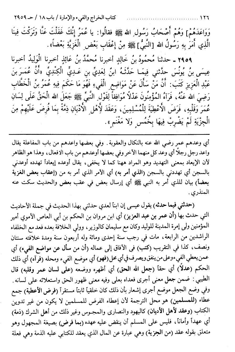 [2961] (حَدَّثَنِي فِيمَا حَدَّثَهُ يَقُولُ عِيسَى إِنَّ ابْنًا لِعَدِيٍّ حَدَّثَنِي بِهَذَا الْحَدِيثِ فِي جُمْلَةِ الْأَحَادِيثِ الَّتِي حَدَّثَ بِهَا (أَنَّ عُمَرَ بْنَ عبد العزيز) أي بن مَرْوَانَ بْنِ الْحَكَمِ بْنِ أَبِي الْعَاصِ الْأُمَوِيَّ أَمِيرَ الْمُؤْمِنِينَ وَلِيَ إِمْرَةَ الْمَدِينَةِ لِلْوَلِيدِ وَكَانَ مَعَ سُلَيْمَانَ كَالْوَزِيرِ وَوَلِيَ الْخِلَافَةَ بَعْدَهُ فَعُدَّ مَعَ الْخُلَفَاءِ الرَّاشِدِينَ مِنَ الرَّابِعَةِ مَاتَ فِي رَجَبٍ سَنَةَ إِحْدَى وَمِائَةٍ وَلَهُ أَرْبَعُونَ سَنَةً وَمُدَّةُ خِلَافَتِهِ سَنَتَانِ وَنِصْفٌ كَذَا فِي التَّقْرِيبِ (كَتَبَ) فِي الْآفَاقِ إِلَى عُمَّالِهِ (إِنَّ مَنْ سَأَلَ عَنْ مَوَاضِعِ الْفَيْءِ) أَيْ عَمَّنْ يُعْطِي الْفَيْءَ وَعَلَى مَنْ يُنْفِقُ وَيَصْرِفُ فِي أَيِّ مَحَلٍّ (فَهُوَ) أَيْ مَوْضِعُ الْفَيْءِ وَمَحَلُّهُ (فَرَآهُ) أَيْ ذَلِكَ الْحُكْمَ (عَدْلًا) أَيْ حَقًّا (جَعَلَ اللَّهُ الْحَقَّ) أَيْ أَظْهَرَهُ وَوَضَعَهُ (عَلَى لِسَانِ عُمَرَ وَقَلْبِهِ) قَالَ الطِّيبِيُّ ضَمَّنَ جَعَلَ مَعْنَى أَجْرَى فَعَدَّاهُ بِعَلَى وَفِيهِ مَعْنَى ظُهُورِ الْحَقِّ وَاسْتِعْلَائِهِ عَلَى لِسَانِهِ