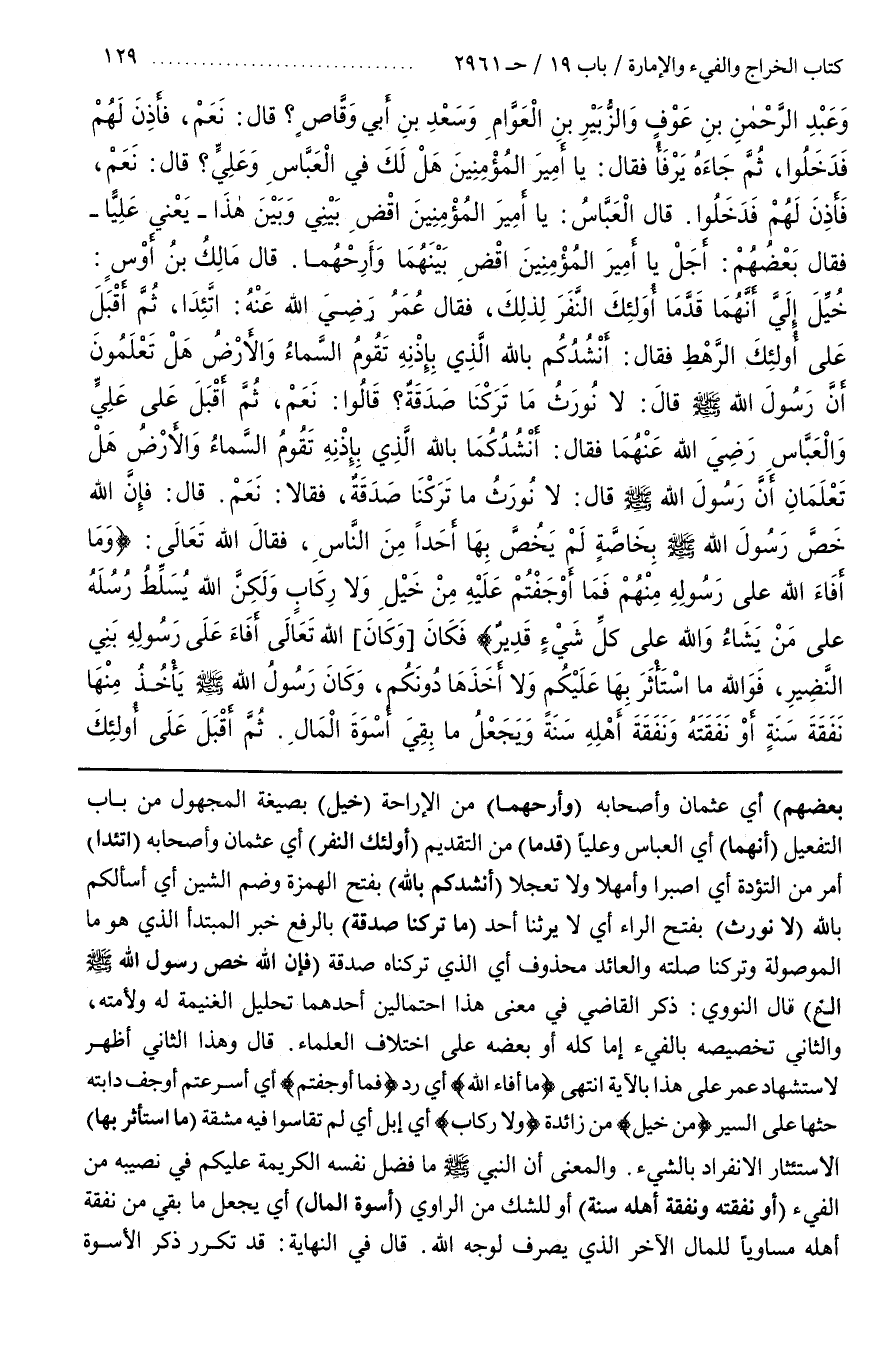 بَعْضُهُمْ) أَيْ عُثْمَانُ وَأَصْحَابُهُ (وَأَرِحْهُمَا) مِنَ الْإِرَاحَةِ (خُيِّلَ) بِصِيغَةِ الْمَجْهُولِ مِنْ بَابِ التَّفْعِيلِ (أَنَّهُمَا) أَيِ الْعَبَّاسَ وَعَلِيًّا (قَدَّمَا) مِنَ التَّقْدِيمِ (أُولَئِكَ النَّفَرَ) أَيْ عُثْمَانَ وَأَصْحَابَهُ (اتَّئِدَا) أَمْرٌ مِنَ التُّؤَدَةِ أَيِ اصْبِرَا وَأَمْهِلَا وَلَا تَعْجَلَا (أَنْشُدكُمْ بِاللَّهِ) بِفَتْحِ الْهَمْزَةِ وَضَمِّ الشِّينِ أَيْ أَسْأَلُكُمْ بِاللَّهِ لَا (نُورَثُ) بِفَتْحِ الرَّاءِ أَيْ لَا يَرِثُنَا أَحَدٌ (مَا تَرَكْنَا صَدَقَةٌ) بِالرَّفْعِ خَبَرُ الْمُبْتَدَأِ الَّذِي هُوَ مَا مَوْصُولَةٌ وَتَرَكْنَا صِلَتُهُ وَالْعَائِدُ مَحْذُوفٌ أَيِ الَّذِي تَرَكْنَاهُ صَدَقَةٌ (فَإِنَّ الله خص رسول الله إِلَخْ) قَالَ النَّوَوِيُّ ذَكَرَ الْقَاضِي فِي مَعْنَى هَذَا احْتِمَالَيْنِ أَحَدُهُمَا تَحْلِيلُ الْغَنِيمَةِ لَهُ وَلِأُمَّتِهِ وَالثَّانِي تَخْصِيصُهُ بِالْفَيْءِ إِمَّا كُلّهُ أَوْ بَعْضُهُ عَلَى اخْتِلَافِ الْعُلَمَاءِ