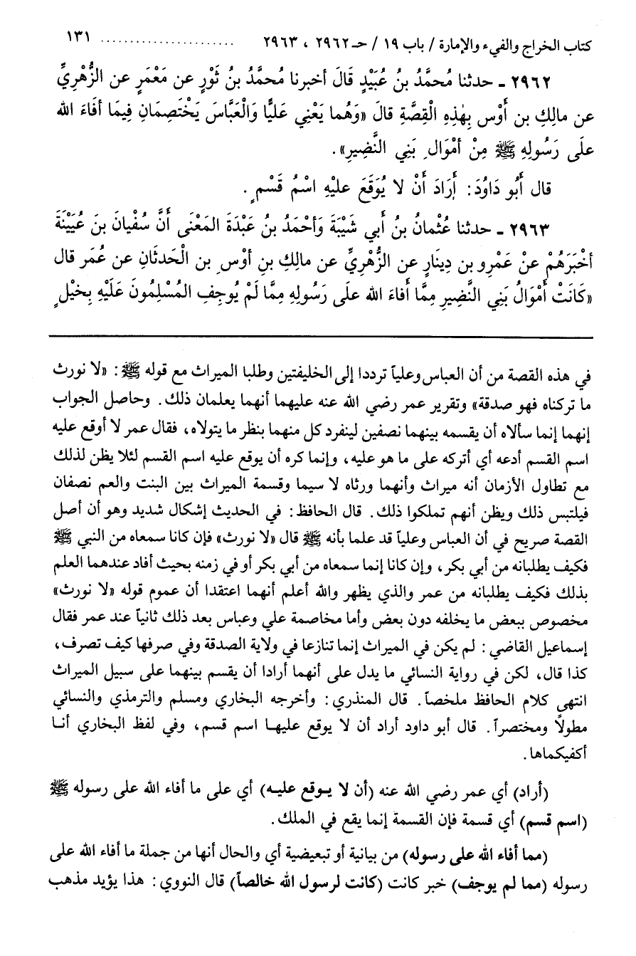 فِي هَذِهِ الْقِصَّةِ مِنْ أَنَّ الْعَبَّاسَ وَعَلِيًّا تردد إلى الخليفتين وطلبا الميراث مع قوله لَا نُورَثُ مَا تَرَكْنَاهُ فَهُوَ صَدَقَةٌ وَتَقْرِيرُ عُمَرَ رَضِيَ اللَّهُ عَنْهُ عَلَيْهِمَا أَنَّهُمَا يَعْلَمَانِ ذَلِكَ
