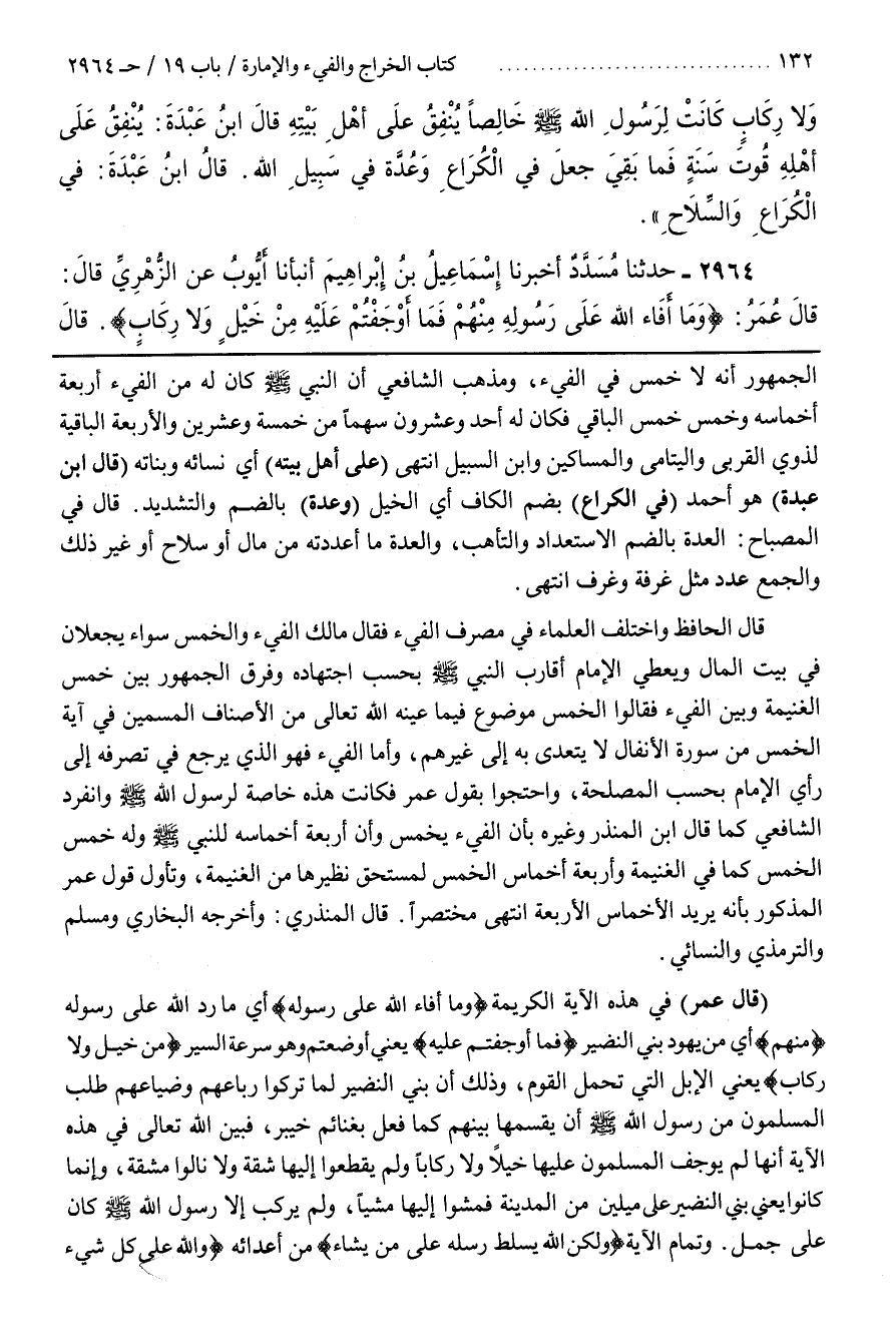 [2966] (قَالَ عُمَرُ) فِي هَذِهِ الْآيَةِ الكريمة (وما أفاء الله على رسوله) أَيْ مَا رَدَّ اللَّهُ عَلَى رَسُولِهِ (مِنْهُمْ) أَيْ مِنْ يَهُودِ بَنِي النَّضِيرِ (فَمَا أَوْجَفْتُمْ عليه) يَعْنِي أَوْضَعْتُمْ وَهُوَ سُرْعَةُ السَّيْرِ (مِنْ خَيْلٍ ولا ركاب) يَعْنِي الْإِبِلَ الَّتِي تَحْمِلُ الْقَوْمَ وَذَلِكَ أَنَّ بَنِي النَّضِيرِ لَمَّا تَرَكُوا رِبَاعَهُمْ وَضِيَاعَهُمْ طَلَبَ المسلمون من رسول الله أَنْ يَقْسِمَهَا بَيْنَهُمْ كَمَا فَعَلَ بِغَنَائِمِ خَيْبَرَ فَبَيَّنَ اللَّهُ تَعَالَى فِي هَذِهِ الْآيَةِ أَنَّهَا لَمْ يُوجِفِ الْمُسْلِمُونَ عَلَيْهَا خَيْلًا وَلَا رِكَابًا وَلَمْ يَقْطَعُوا إِلَيْهَا شُقَّةً وَلَا نَالُوا مَشَقَّةً وَإِنَّمَا كَانُوا يَعْنِي بَنِي النَّضِيرِ عَلَى مِيلَيْنِ مِنَ الْمَدِينَةِ فَمَشَوْا إِلَيْهَا مَشْيًا وَلَمْ يَرْكَبْ إلا رسول الله كَانَ عَلَى جَمَلٍ