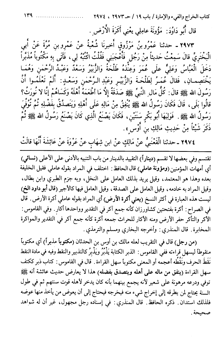 تَقْتَسِمُ وَفِي بَعْضِهَا لَا تَقْسِمُ (دِينَارًا) التَّقْيِيدُ بِالدِّينَارِ مِنْ بَابِ التَّنْبِيهِ بِالْأَدْنَى عَلَى الْأَعْلَى (نِسَائِي) أَيْ أُمَّهَاتِ الْمُؤْمِنِينَ (وَمُؤْنَةِ عَامِلِي) قَالَ الْحَافِظُ اخْتُلِفَ فِي الْمُرَادِ بِقَوْلِهِ عَامِلِي فَقِيلَ الْخَلِيفَةُ بَعْدَهُ وَهَذَا هُوَ الْمُعْتَمَدُ وَقِيلَ يُرِيدُ بِذَلِكَ الْعَامِلَ عَلَى النَّخْلِ وَبِهِ جَزَمَ الطَّبَرِيُّ وبن بَطَّالٍ وَقِيلَ الْمُرَادُ بِهِ خَادِمُهُ وَقِيلَ الْعَامِلُ عَلَى الصَّدَقَةِ وَقِيلَ الْعَامِلُ فِيهَا كَالْأَجِيرِ (قَالَ أَبُو دَاوُدَ إِلَخْ) لَيْسَتْ هَذِهِ الْعِبَارَةُ فِي أَكْثَرِ النُّسَخِ (يَعْنِي أَكَرَةَ الْأَرْضِ) أَيِ الْمُرَادُ بِقَوْلِهِ عَامِلِي أَكَرَةِ الْأَرْضِ