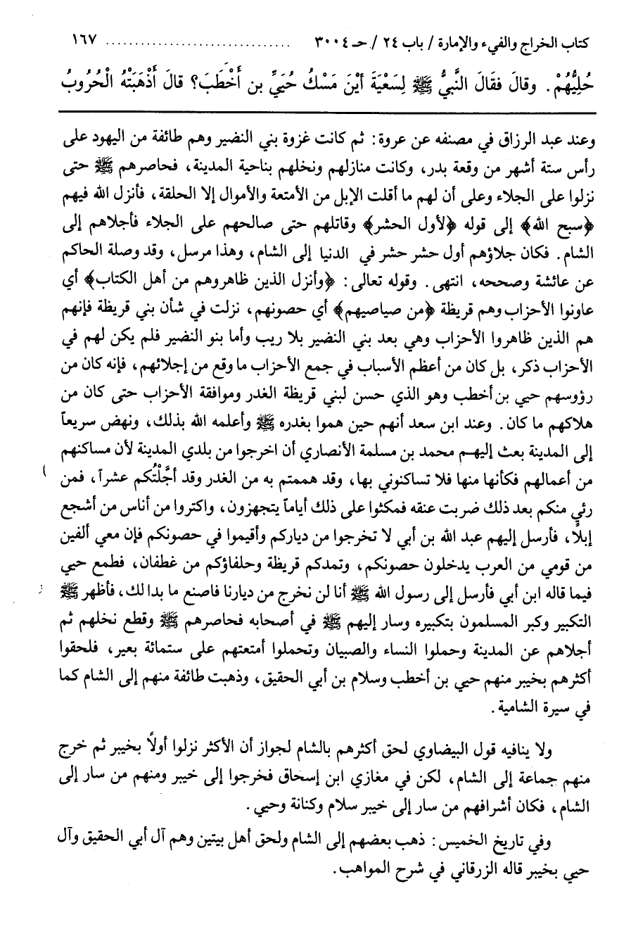 وَعِنْدَ عَبْدِ الرَّزَّاقِ فِي مُصَنَّفِهِ عَنْ عُرْوَةَ ثُمَّ كَانَتْ غَزْوَةُ بَنِي النَّضِيرِ وَهُمْ طَائِفَةٌ مِنَ الْيَهُودِ عَلَى رَأْسِ سِتَّةِ أَشْهُرٍ مِنْ وَقْعَةِ بَدْرٍ وَكَانَتْ مَنَازِلُهُمْ وَنَخْلُهُمْ بِنَاحِيَةِ الْمَدِينَةِ فَحَاصَرَهُمْ صَلَّى اللَّهُ عَلَيْهِ وَسَلَّمَ حَتَّى نَزَلُوا عَلَى الْجَلَاءِ وَعَلَى أَنَّ لَهُمْ مَا أَقَلَّتِ الْإِبِلُ مِنَ الْأَمْتِعَةِ وَالْأَمْوَالِ إِلَّا الْحَلْقَةَ فَأَنْزَلَ الله فيهم (سبح الله) إلى قوله (لأول الحشر) وَقَاتَلَهُمْ حَتَّى صَالَحَهُمْ عَلَى الْجَلَاءِ فَأَجْلَاهُمْ إِلَى الشَّامِ فَكَانَ جَلَاؤُهُمْ أَوَّلَ حَشْرِ حُشِرَ فِي الدُّنْيَا إِلَى الشَّامِ وَهَذَا مُرْسَلٌ وَقَدْ وَصَلَهُ الْحَاكِمُ عَنْ عَائِشَةَ وَصَحَّحَهُ انْتَهَى