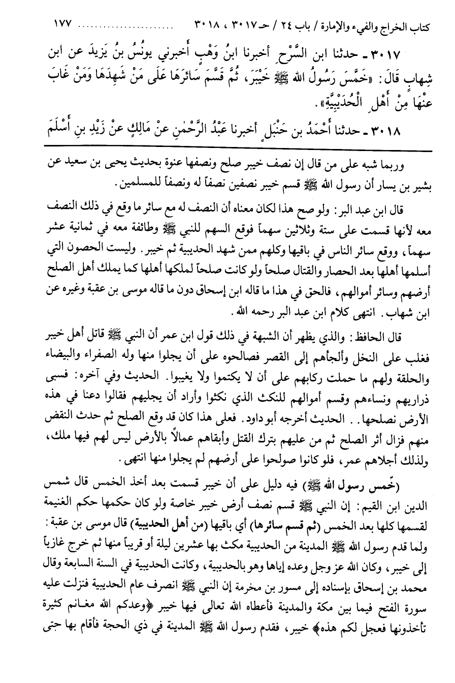 [3019] (خَمَّسَ رَسُولُ الله) فِيهِ دَلِيلٌ عَلَى أَنَّ خَيْبَرَ قُسِمَتْ بَعْدَ أخذ الخمس قال بن القيم أن النبي قَسَّمَ نِصْفَ أَرْضِ خَيْبَرَ خَاصَّةً وَلَوْ كَانَ حُكْمُهَا حُكْمَ الْغَنِيمَةِ لَقَسَّمَهَا كُلَّهَا بَعْدَ الْخُمُسِ (ثُمَّ قَسَمَ سَائِرَهَا) أَيْ بَاقِيَهَا (مِنْ أَهْلِ الْحُدَيْبِيَةِ) قَالَ مُوسَى بْنُ عُقْبَةَ وَلَمَّا قَدِمَ رسول الله الْمَدِينَةَ مِنَ الْحُدَيْبِيَةِ مَكَثَ بِهَا عِشْرِينَ لَيْلَةً أَوْ قَرِيبًا مِنْهَا ثُمَّ خَرَجَ غَازِيًا إِلَى خَيْبَرَ وَكَانَ اللَّهُ عَزَّ وَجَلَّ وَعَدَهُ إِيَّاهَا وَهُوَ بِالْحُدَيْبِيَةِ وَكَانَتِ الْحُدَيْبِيَةُ فِي السَّنَةِ السَّابِعَةِ وَقَالَ مُحَمَّدُ بْنُ إِسْحَاقَ بِإِسْنَادِهِ إِلَى مِسْوَرِ بن محرمة إن النبي انْصَرَفَ عَامَ الْحُدَيْبِيَةِ فَنَزَلَتْ عَلَيْهِ سُورَةُ الْفَتْحِ فِيمَا بَيْنَ مَكَّةَ وَالْمَدِينَةِ فَأَعْطَاهُ اللَّهُ تَعَالَى فِيهَا خَيْبَرَ (وَعَدَكُمُ اللَّهُ مَغَانِمَ كَثِيرَةً تَأْخُذُونَهَا فَعَجَّلَ لَكُمْ هذه) خيبر فقدم رسول الله الْمَدِينَةَ فِي ذِي الْحِجَّةِ فَأَقَامَ بِهَا حَتَّى