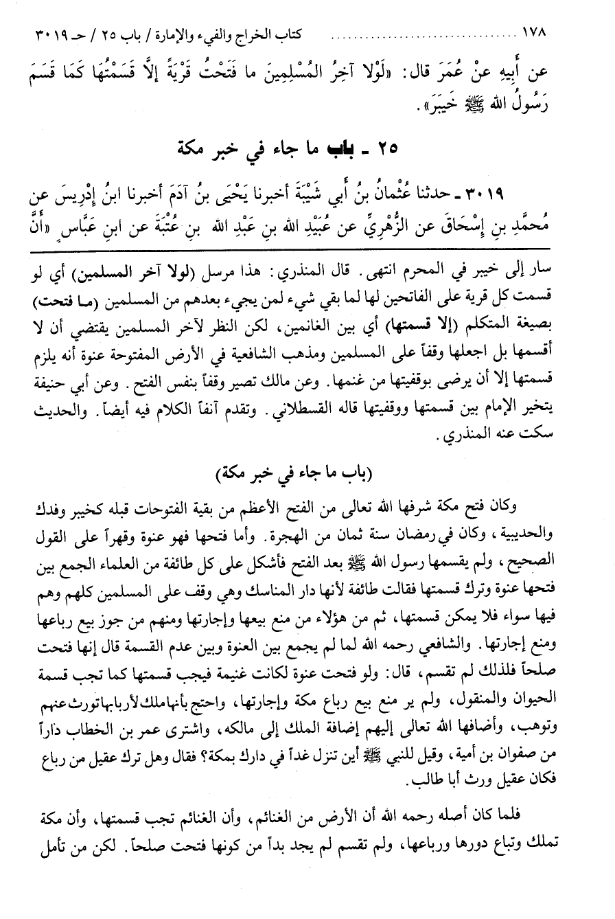 [3020] (لَوْلَا آخِرُ الْمُسْلِمِينَ) أَيْ لَوْ قُسِمَتْ كُلُّ قَرْيَةٍ عَلَى الْفَاتِحِينَ لَهَا لَمَا بَقِيَ شَيْءٌ لِمَنْ يَجِيءُ بَعْدَهُمْ مِنَ الْمُسْلِمِينَ (مَا فَتَحْتُ) بِصِيغَةِ الْمُتَكَلِّمِ ((إِلَّا قَسَمْتُهَا) أَيْ بَيْنَ الْغَانِمِينَ لَكِنِ النَّظَرُ لِآخِرِ الْمُسْلِمِينَ يَقْتَضِي أَنْ لَا أَقْسِمَهَا بَلْ أَجْعَلَهَا وَقْفًا عَلَى الْمُسْلِمِينَ وَمَذْهَبُ الشَّافِعِيَّةِ فِي الْأَرْضِ الْمَفْتُوحَةِ عَنْوَةً أَنَّهُ يَلْزَمُ قِسْمَتُهَا إِلَّا أَنْ يَرْضَى بِوَقْفِيَّتِهَا مَنْ غَنِمَهَا