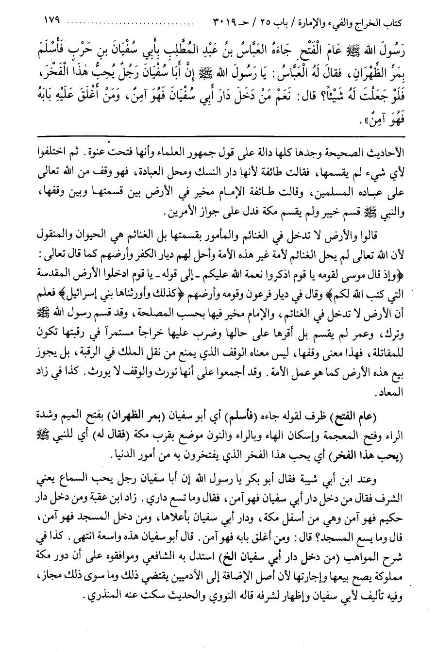 كَذَا فِي شَرْحِ الْمَوَاهِبِ (مَنْ دَخَلَ دَارَ أَبِي سُفْيَانَ إِلَخْ) اسْتَدَلَّ بِهِ الشَّافِعِيُّ وَمُوَافِقُوهُ عَلَى أَنَّ دُورَ مَكَّةَ مَمْلُوكَةٌ يَصِحُّ بَيْعُهَا وَإِجَارَتُهَا لِأَنَّ أَصْلَ الْإِضَافَةِ إِلَى الْآدَمِيِّينَ يَقْتَضِي ذَلِكَ وَمَا سِوَى ذَلِكَ مَجَازٌ وَفِيهِ تأليف لأبي سفيان وإظهار لشرفه قاله النوري وَالْحَدِيثُ سَكَتَ عَنْهُ الْمُنْذِرِيُّ