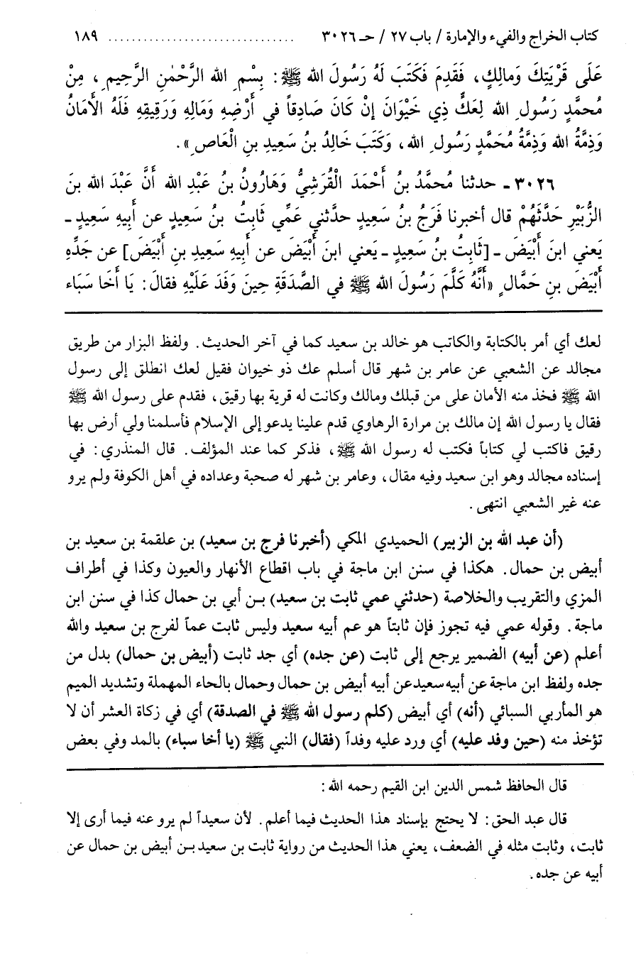 وَقَوْلُهُ عَمِّي فِيهِ تَجَوُّزٌ فَإِنَّ ثَابِتًا هُوَ عَمِّ أَبِيهِ سَعِيدٍ وَلَيْسَ ثَابِتٌ عَمًّا لِفَرَجِ بْنِ سَعِيدٍ وَاللَّهُ أَعْلَمُ (عَنْ أَبِيهِ) الضَّمِيرُ يَرْجِعُ إِلَى ثَابِتٍ (عَنْ جَدِّهِ) أَيْ جَدِّ ثَابِتٍ (أَبْيَضَ بْنِ حَمَّالٍ) بَدَلٌ مِنْ جده ولفظ بن مَاجَهْ عَنْ أَبِيهِ سَعِيدٍ عَنْ أَبِيهِ أَبْيَضِ بْنِ حَمَّالٍ وَحَمَّالٌ بِالْحَاءِ الْمُهْمَلَةِ وَتَشْدِيدِ الْمِيمِ هُوَ الْمَأْرِبِيُّ السَّبَائِيُّ (أَنَّهُ) أَيْ أَبْيَضُ (كَلَّمَ رَسُولَ اللَّهِ صَلَّى اللَّهُ عَلَيْهِ وَسَلَّمَ في الصَّدَقَةِ) أَيْ فِي زَكَاةِ الْعُشْرِ أَنْ لَا تُؤْخَذَ مِنْهُ (حِينَ وَفَدَ عَلَيْهِ) أَيْ وَرَدَ عَلَيْهِ وَفْدًا (فَقَالَ) النَّبِيُّ صَلَّى اللَّهُ عَلَيْهِ وَسَلَّمَ (يَا أَخَا سَبَاءٍ) بِالْمَدِّ وَفِي بَعْضِ