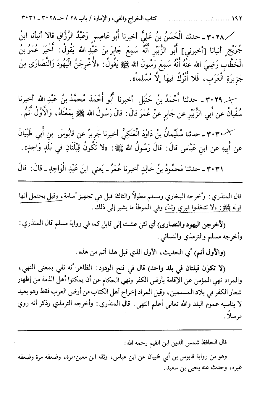 [3030] (لَأُخْرِجَنَّ الْيَهُودَ وَالنَّصَارَى) أَيْ لَأَنْ عِشْتُ إِلَى قَابِلٍ كَمَا فِي رِوَايَةِ مُسْلِمٍ قَالَ الْمُنْذِرِيُّ وَأَخْرَجَهُ مُسْلِمٌ وَالتِّرْمِذِيُّ وَالنَّسَائِيُّ