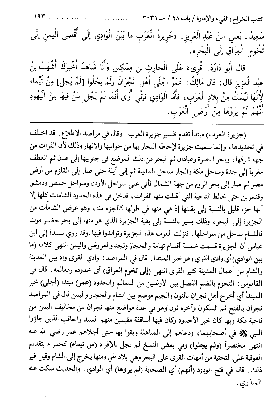[3033] (جَزِيرَةُ الْعَرَبِ) مُبْتَدَأٌ تَقَدَّمَ تَفْسِيرُ جَزِيرَةِ الْعَرَبِ وَقَالَ فِي مَرَاصِدِ الِاطِّلَاعِ قَدِ اخْتُلِفَ فِي تَحْدِيدِهَا وَإِنَّمَا سُمِّيَتْ جَزِيرَةٌ لِإِحَاطَةِ الْبِحَارِ بِهَا مِنْ جَوَانِبِهَا وَالْأَنْهَارِ وَذَلِكَ لِأَنَّ الْفُرَاتَ مِنْ جهة شرقها وبحر البصرة وعبادان ثُمَّ الْبَحْرَ مِنْ ذَلِكَ الْمَوْضِعِ فِي جَنُوبَيْهَا إِلَى عَدَنٍ ثُمَّ انْعَطَفَ مَغْرِبًا إِلَى جُدَّةَ وَسَاحِلِ مَكَّةَ وَالْجَارِ سَاحِلِ الْمَدِينَةِ ثُمَّ إِلَى أَيْلَةَ حَتَّى صَارَ إِلَى الْقَلْزَمِ مِنْ أَرْضِ مِصْرَ ثُمَّ صَارَ إِلَى بَحْرِ الرُّومِ مِنْ جِهَةِ الشَّمَالِ فَأَتَى عَلَى سَوَاحِلِ الْأُرْدُنِّ وَسَوَاحِلِ حِمْصٍ وَدِمَشْقَ وَقِنَّسْرِينَ حَتَّى خَالَطَ النَّاحِيَةَ الَّتِي أَقْبَلَتْ مِنْهَا الْفُرَاتُ فَدَخَلَ فِي هَذِهِ الْحُدُودِ الشَّامَاتِ كُلُّهَا إِلَّا أَنَّهَا جُزْءٌ قَلِيلٌ بِالنِّسْبَةِ إِلَى بَقِيَّتِهَا إِذْ هِيَ مِنْهَا فِي طُولِهَا كَالْجُزْءِ مِنْهُ وَهُوَ عَرْضُ الشَّامَاتِ مِنَ الْجَزِيرَةِ إِلَى الْبَحْرِ وَذَلِكَ يَسِيرٌ بِالنِّسْبَةِ إِلَى بَقِيَّةِ الْجَزِيرَةِ الَّذِي هُوَ مِنْهَا إِلَى بَحْرِ حَضْرَمَوْتَ فَالشَّامُ سَاحِلٌ مِنْ سَوَاحِلِهَا فَنَزَلَتِ الْعَرَبُ هَذِهِ الجزيرة وتوالدوا فيها
