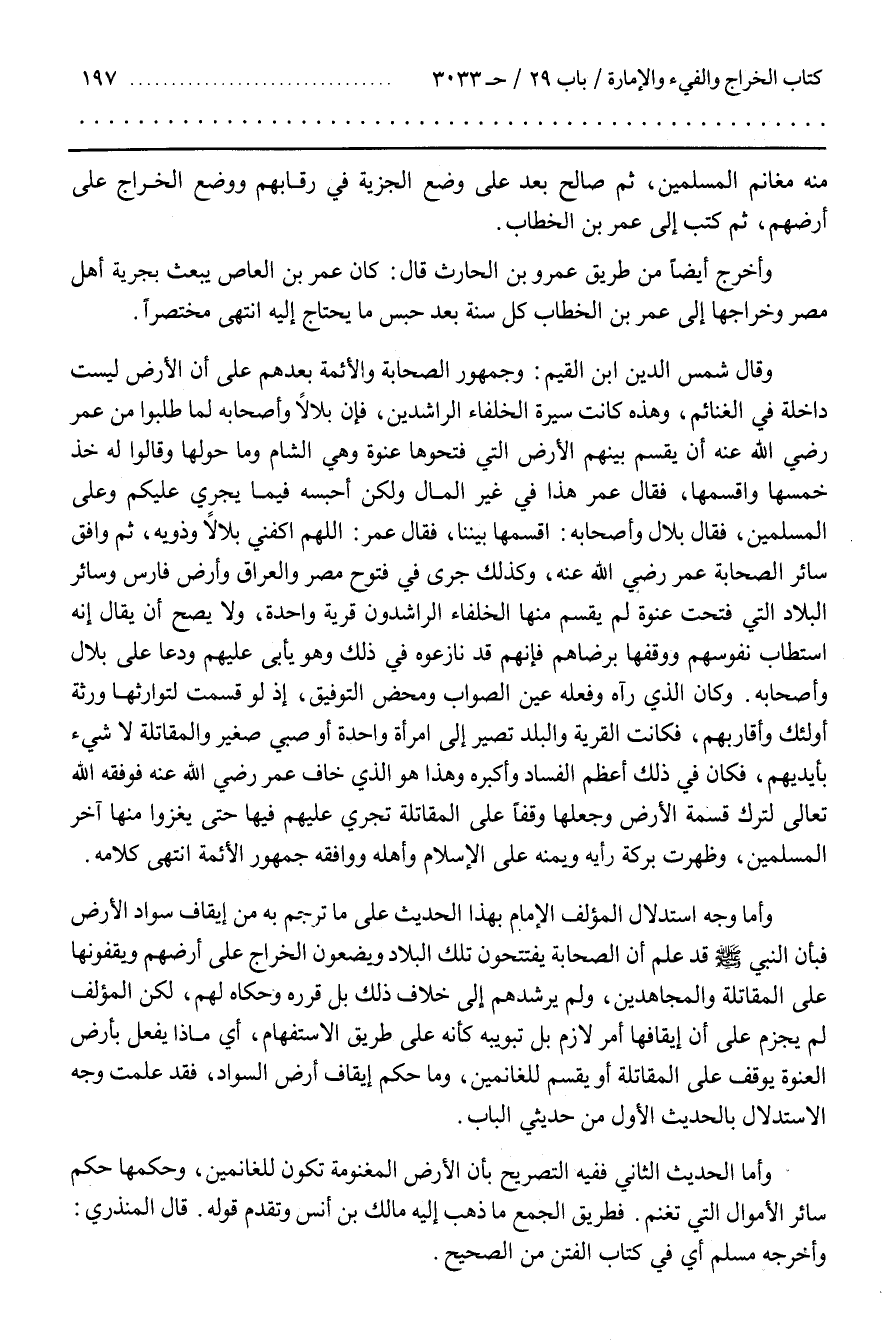 وقال بن الْقَيِّمِ وَجُمْهُورُ الصَّحَابَةِ وَالْأَئِمَّةِ بَعْدَهُمْ عَلَى أَنَّ الْأَرْضَ لَيْسَتْ دَاخِلَةً فِي الْغَنَائِمِ وَهَذِهِ كَانَتْ سِيرَةَ الْخُلَفَاءِ الرَّاشِدِينَ فَإِنَّ بِلَالًا وَأَصْحَابَهُ لَمَّا طَلَبُوا مِنْ عُمَرَ رَضِيَ اللَّهُ عَنْهُ أَنْ يُقَسِّمَ بَيْنَهُمُ الْأَرْضَ الَّتِي فَتَحُوهَا عَنْوَةً وَهِيَ الشَّامُ وَمَا حَوْلَهَا وَقَالُوا لَهُ خُذْ خُمُسهَا وَاقْسِمْهَا فَقَالَ عُمَرُ هَذَا فِي غَيْرِ الْمَالِ وَلَكِنْ أَحْبِسُهُ فِيمَا يَجْرِي عَلَيْكُمْ وَعَلَى الْمُسْلِمِينَ فَقَالَ بِلَالٌ وَأَصْحَابُهُ اقْسِمْهَا بَيْنَنَا فَقَالَ عُمَرُ اللَّهُمَّ اكْفِنِي بِلَالًا وَذَوِيهِ ثُمَّ وَافَقَ سَائِرُ الصَّحَابَةِ عُمَرَ رَضِيَ اللَّهُ عَنْهُ وَكَذَلِكَ جَرَى فِي فُتُوحِ مِصْرَ وَالْعِرَاقِ وَأَرْضِ فَارِسٍ وَسَائِرِ الْبِلَادِ الَّتِي فُتِحَتْ عَنْوَةً لَمْ يَقْسِمْ مِنْهَا الْخُلَفَاءُ الرَّاشِدُونَ قَرْيَةً وَاحِدَةً وَلَا يَصِحُّ أَنْ يُقَالَ إِنَّهُ اسْتَطَابَ نُفُوسِهِمْ وَوَقَفَهَا بِرِضَاهُمْ فَإِنَّهُمْ قَدْ نَازَعُوهُ فِي ذَلِكَ وَهُوَ يَأْبَى عَلَيْهِمْ وَدَعَا عَلَى بِلَالٍ وَأَصْحَابِهِ