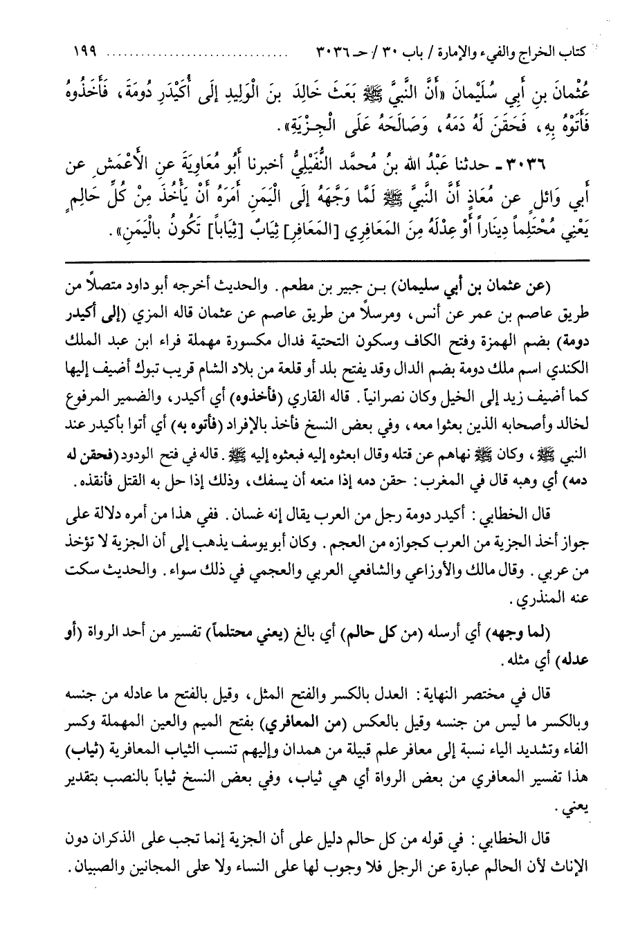 قَالَ الْخَطَّابِيُّ فِي قَوْلِهِ مِنْ كُلِّ حَالِمٍ دَلِيلٌ عَلَى أَنَّ الْجِزْيَةَ إِنَّمَا تَجِبُ عَلَى الذُّكْرَانِ دُونَ الْإِنَاثِ لِأَنَّ الْحَالِمَ عِبَارَةٌ عَنِ الرَّجُلِ فَلَا وُجُوبَ لَهَا عَلَى النِّسَاءِ وَلَا عَلَى الْمَجَانِينِ وَالصِّبْيَانِ
