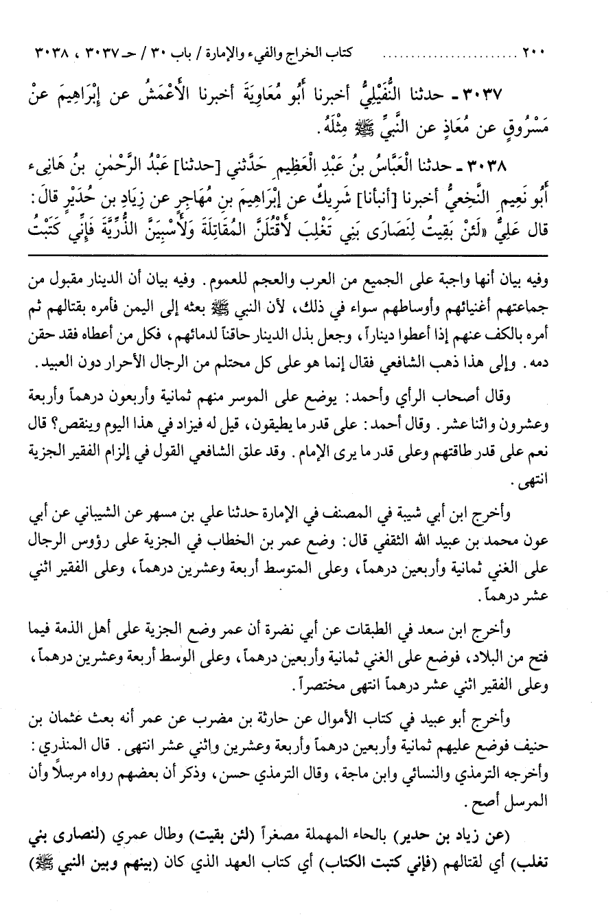 وأخرج بن أَبِي شَيْبَةَ فِي الْمُصَنَّفِ فِي الْإِمَارَةِ حَدَّثَنَا عَلِيُّ بْنُ مُسْهِرٍ عَنِ الشَّيْبَانِيِّ عَنْ أَبِي عَوْنٍ مُحَمَّدِ بْنِ عُبَيْدِ اللَّهِ الثَّقَفِيِّ قَالَ وَضَعَ عُمَرُ بْنُ الْخَطَّابِ فِي الْجِزْيَةِ عَلَى رؤوس الرِّجَالِ عَلَى الْغَنِيِّ ثَمَانِيَةً وَأَرْبَعِينَ دِرْهَمًا وَعَلَى الْمُتَوَسِّطِ أَرْبَعَةً وَعِشْرِينَ دِرْهَمًا وَعَلَى الْفَقِيرِ اثْنَيْ عشر درهما