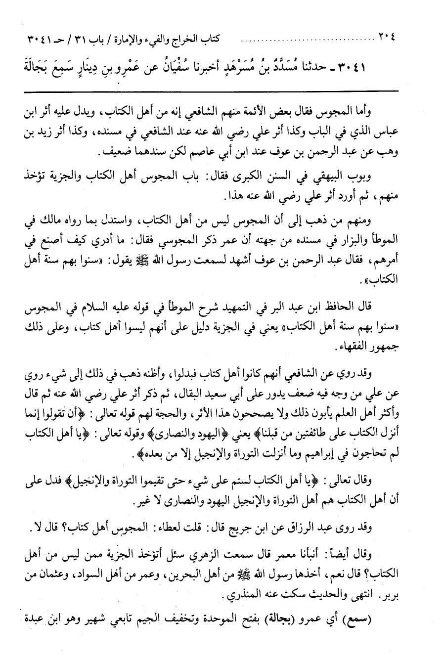 وَمِنْهُمْ مَنْ ذَهَبَ إِلَى أَنَّ الْمَجُوسَ لَيْسَ مِنْ أَهْلِ الْكِتَابِ وَاسْتَدَلَّ بِمَا رَوَاهُ مَالِكٌ فِي الْمُوَطَّأِ وَالْبَزَّارُ فِي مُسْنَدِهِ مِنْ جِهَتِهِ أَنَّ عُمَرَ ذَكَرَ الْمَجُوسِيَّ فَقَالَ مَا أَدْرِي كَيْفَ أَصْنَعُ فِي أَمْرِهِمْ فَقَالَ عَبْدُ الرَّحْمَنِ بْنُ عَوْفٍ أَشْهَدُ لَسَمِعْتُ رَسُولَ اللَّهِ صَلَّى اللَّهُ عَلَيْهِ وَسَلَّمَ يَقُولُ سُنُّوا بِهِمْ سُنَّةَ أَهْلِ الْكِتَابِ
