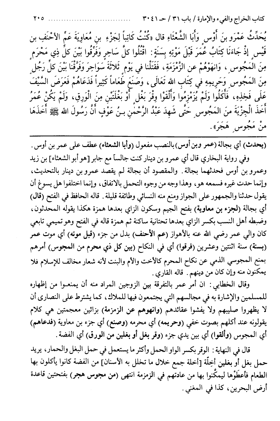 وَقَالَ الْخَطَّابِيُّ إِنَّ أَمْرَ عُمَرَ بِالتَّفْرِقَةِ بَيْنَ الزَّوْجَيْنِ الْمُرَادُ مِنْهُ أَنْ يَمْنَعُوا مِنْ إِظْهَارِهِ لِلْمُسْلِمِينَ وَالْإِشَارَةِ بِهِ فِي مَجَالِسِهِمُ الَّتِي يَجْتَمِعُونَ فيها لِلْمِلَاكِ كَمَا يُشْتَرَطٌ عَلَى النَّصَارَى أَنْ لَا يُظْهِرُوا صَلِيبَهُمْ وَلَا يُفْشُوا عَقَائِدَهُمْ (وَانْهَوْهُمْ عَنِ الزَّمْزَمَةِ) بِزَائَيْنِ مُعْجَمَتَيْنِ هِيَ كَلَامٌ يَقُولُونَهُ عِنْدَ أَكْلِهِمْ بِصَوْتٍ خَفِيِّ (وَحَرِيمِهِ) أَيْ مَحْرَمِهِ (وَصَنَعَ) أَيْ جَزْءُ بْنُ مُعَاوِيَةَ (فَدَعَاهُمْ) أَيِ الْمَجُوسَ (وَأَلْقَوْا) أَيْ بَيْنَ يَدَيْ جَزْءٍ (وِقْرَ بَغْلٍ أَوْ بَغْلَيْنِ مِنَ الْوَرِقِ) أَيِ الْفِضَّةِ