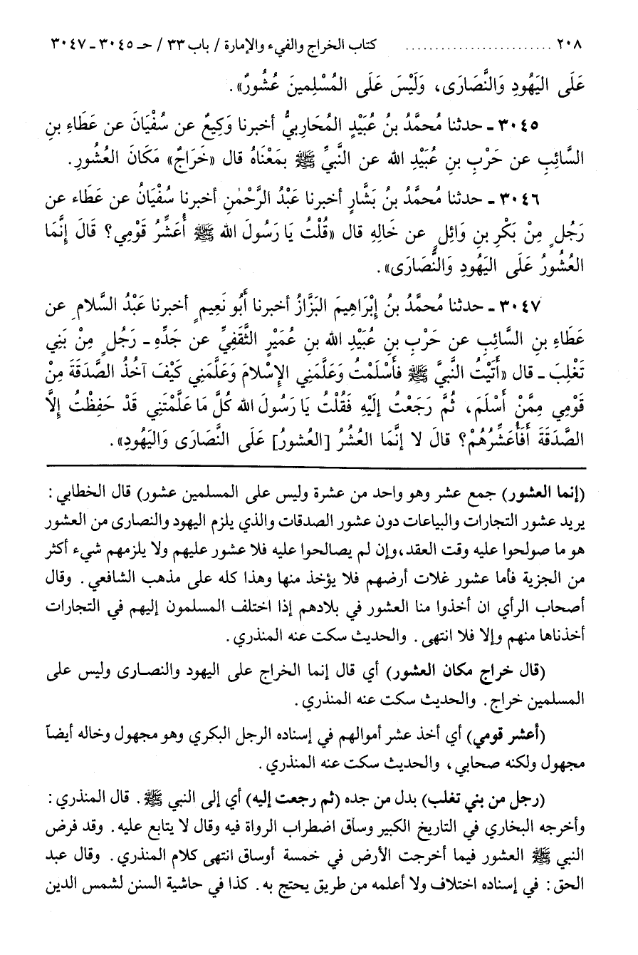 [3048] (أُعَشِّرُ قَوْمِي) أَيْ آَخُذُ عُشْرَ أَمْوَالِهِمْ فِي إِسْنَادِهِ الرَّجُلُ الْبَكْرِيُّ وَهُوَ مَجْهُولٌ وَخَالُهُ أَيْضًا مَجْهُولٌ وَلَكِنَّهُ صَحَابِيٌّ وَالْحَدِيثُ سَكَتَ عَنْهُ الْمُنْذِرِيُّ