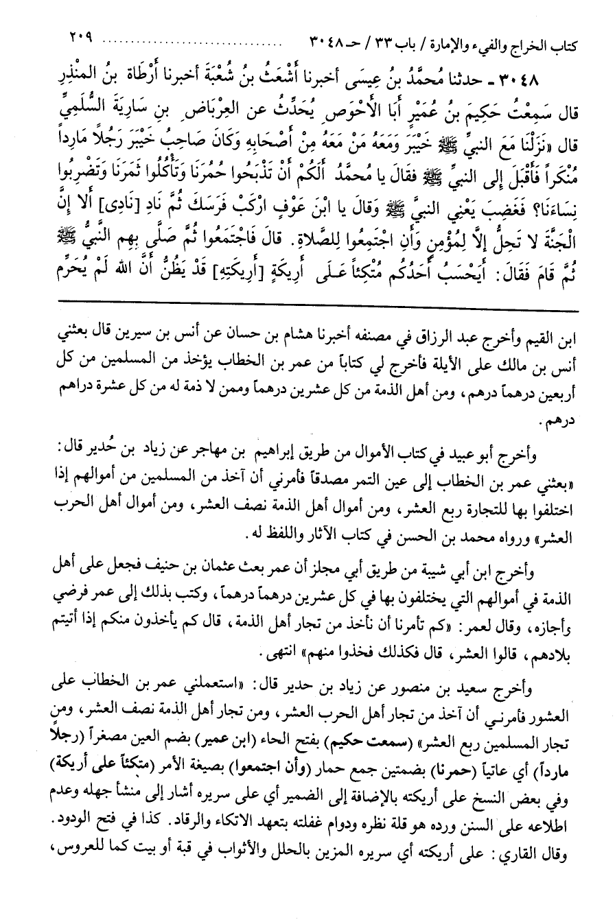 وَأَخْرَجَ سَعِيدُ بْنُ مَنْصُورٍ عَنْ زِيَادِ بْنِ حُدَيْرٍ قَالَ اسْتَعْمَلَنِي عُمَرُ بْنُ الْخَطَّابِ عَلَى الْعُشُورِ فَأَمَرَنِي أَنْ آخُذَ مِنْ تُجَّارِ أَهْلِ الْحَرْبِ الْعُشْرَ وَمِنْ تُجَّارِ أَهْلِ الذِّمَّةِ نِصْفَ الْعُشْرِ وَمِنْ تُجَّارِ الْمُسْلِمِينَ رُبْعَ الْعُشْرِ [3050] (سَمِعْتُ حكيم) بفتح الحاء (بن عُمَيْرٍ) بِضَمِّ الْعَيْنِ مُصَغَّرًا (رَجُلًا مَارِدًا) أَيْ عَاتِيًا (حُمُرَنَا) بِضَمَّتَيْنِ جَمْعُ حِمَارٍ (وَأَنِ اجْتَمِعُوا) بِصِيغَةِ الْأَمْرِ (مُتَّكِئًا عَلَى أَرِيكَةٍ) وَفِي بَعْضِ النُّسَخِ عَلَى أَرِيكَتِهِ بِالْإِضَافَةِ إِلَى الضَّمِيرِ أَيْ عَلَى سَرِيرِهِ أَشَارَ إِلَى مَنْشَأِ جَهْلِهِ وَعَدَمِ اطِّلَاعِهِ عَلَى السُّنَنِ وَرَدَّهُ هُوَ قِلَّةُ نَظَرِهِ وَدَوَامُ غَفْلَتِهِ بِتَعَهُّدِ الِاتِّكَاءِ وَالرُّقَادِ