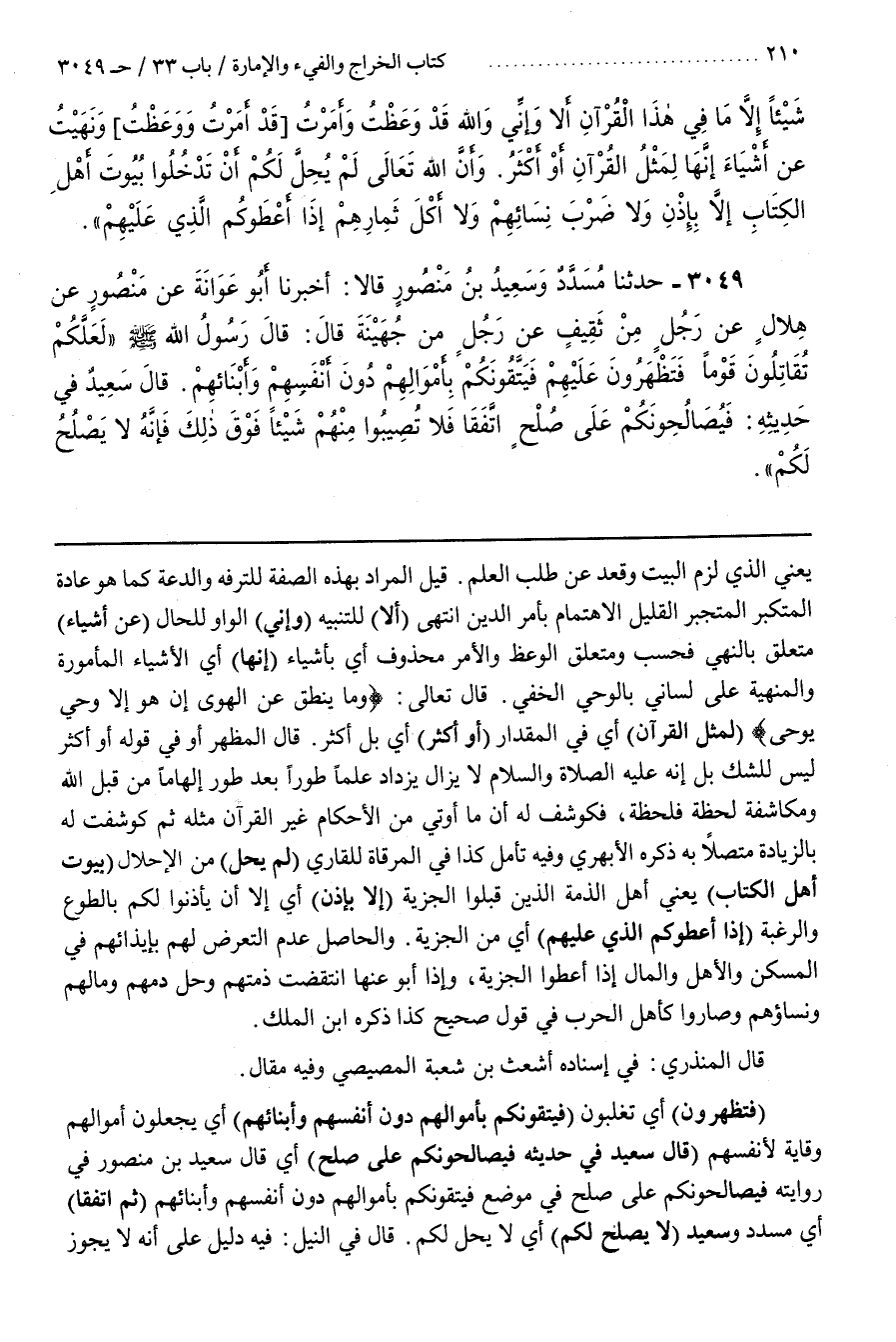 قَالَ الْمُظْهِرُ أَوْ فِي قَوْلِهِ أَوْ أَكْثَرُ لَيْسَ لِلشَّكِّ بَلْ إِنَّهُ عَلَيْهِ الصَّلَاةُ وَالسَّلَامُ لَا يَزَالُ يَزْدَادُ عِلْمًا طَوْرًا بَعْدَ طَوْرٍ إِلْهَامًا مِنْ قِبَلِ اللَّهِ وَمُكَاشَفَةً لَحْظَةً فَلَحْظَةً فَكُوشِفَ لَهُ أَنَّ مَا أُوتِيَ مِنَ الْأَحْكَامِ غَيْرِ الْقُرْآنِ مِثْلُهُ ثُمَّ كُوشِفَتْ لَهُ بِالزِّيَادَةِ مُفَصَّلًا بِهِ ذَكَرَهُ الْأَبْهَرِيُّ وَفِيهِ تَأَمُّلٌ كَذَا فِي الْمِرْقَاةِ لِلْقَارِيِّ (لَمْ يُحِلَّ) مِنَ الْإِحْلَالِ (بُيُوتِ أَهْلِ الْكِتَابِ) يَعْنِي أَهْلِ الذِّمَّةِ الَّذِينَ قَبِلُوا الْجِزْيَةَ (إِلَّا بِإِذْنٍ) أَيْ إِلَّا أَنْ يَأْذَنُوا لَكُمْ بِالطَّوْعِ وَالرَّغْبَةِ (إِذَا أَعْطَوْكُمُ الذِي عَلَيْهِمْ) أَيْ مِنَ الْجِزْيَةِ
