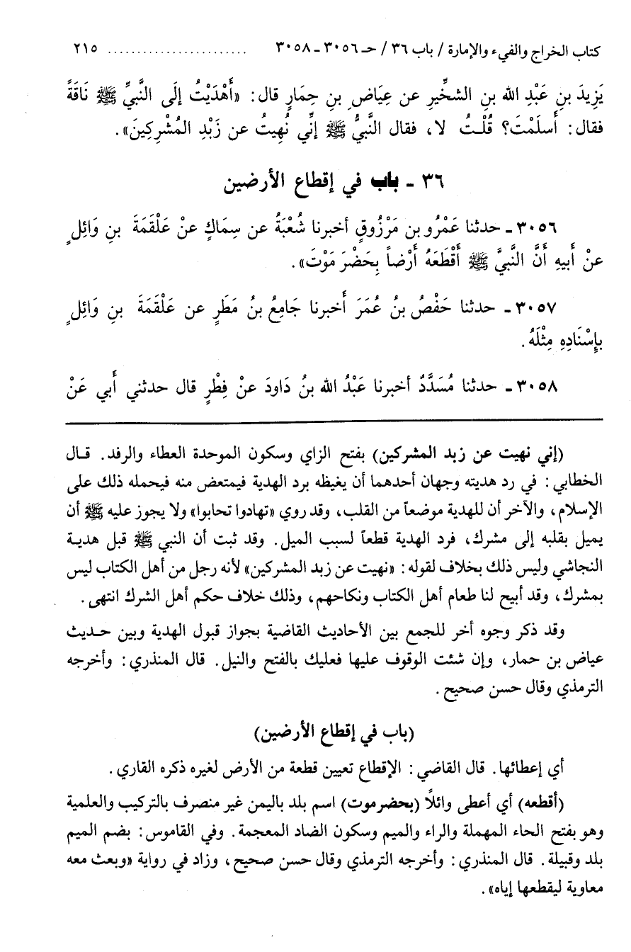 [3058] قَالَ الْقَاضِي الْإِقْطَاعُ تَعْيِينُ قِطْعَةٍ من الأرض لغيره ذكره القارىء