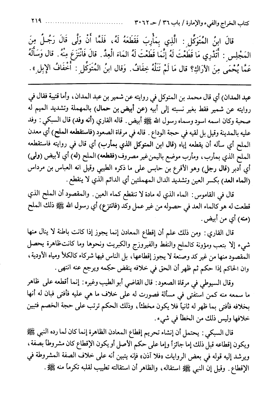 قَالَ القارىء وَمِنْ ذَلِكَ عُلِمَ أَنَّ إِقْطَاعَ الْمَعَادِنِ إِنَّمَا يَجُوزُ إِذَا كَانَتْ بَاطِنَةً لَا يُنَالُ مِنْهَا شَيْءٌ إِلَّا بِتَعَبٍ وَمُؤْنَةٍ كَالْمِلْحِ وَالنِّفْطِ وَالْفَيْرُوزَجِ وَالْكِبْرِيتِ وَنَحْوِهَا وَمَا كَانَتْ ظَاهِرَةً يَحْصُلُ الْمَقْصُودُ مِنْهَا مِنْ غَيْرِ كَدٍّ وَصَنْعَةٍ لَا يَجُوزُ إِقْطَاعُهَا بَلِ النَّاسُ فِيهَا شُرَكَاءُ كَالْكَلَأِ وَمِيَاهِ الْأَوْدِيَةِ وَأَنَّ الْحَاكِمَ إِذَا حَكَمَ ثُمَّ ظَهَرَ أَنَّ الْحَقَّ فِي خِلَافِهِ يُنْقَضُ حُكْمُهُ وَيُرْجَعُ عَنْهُ انْتَهَى